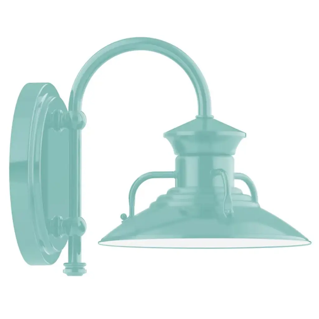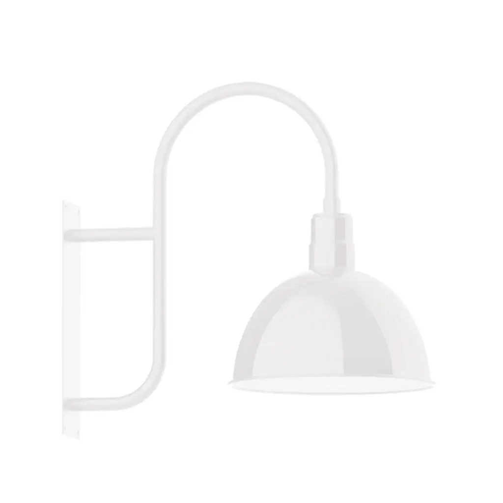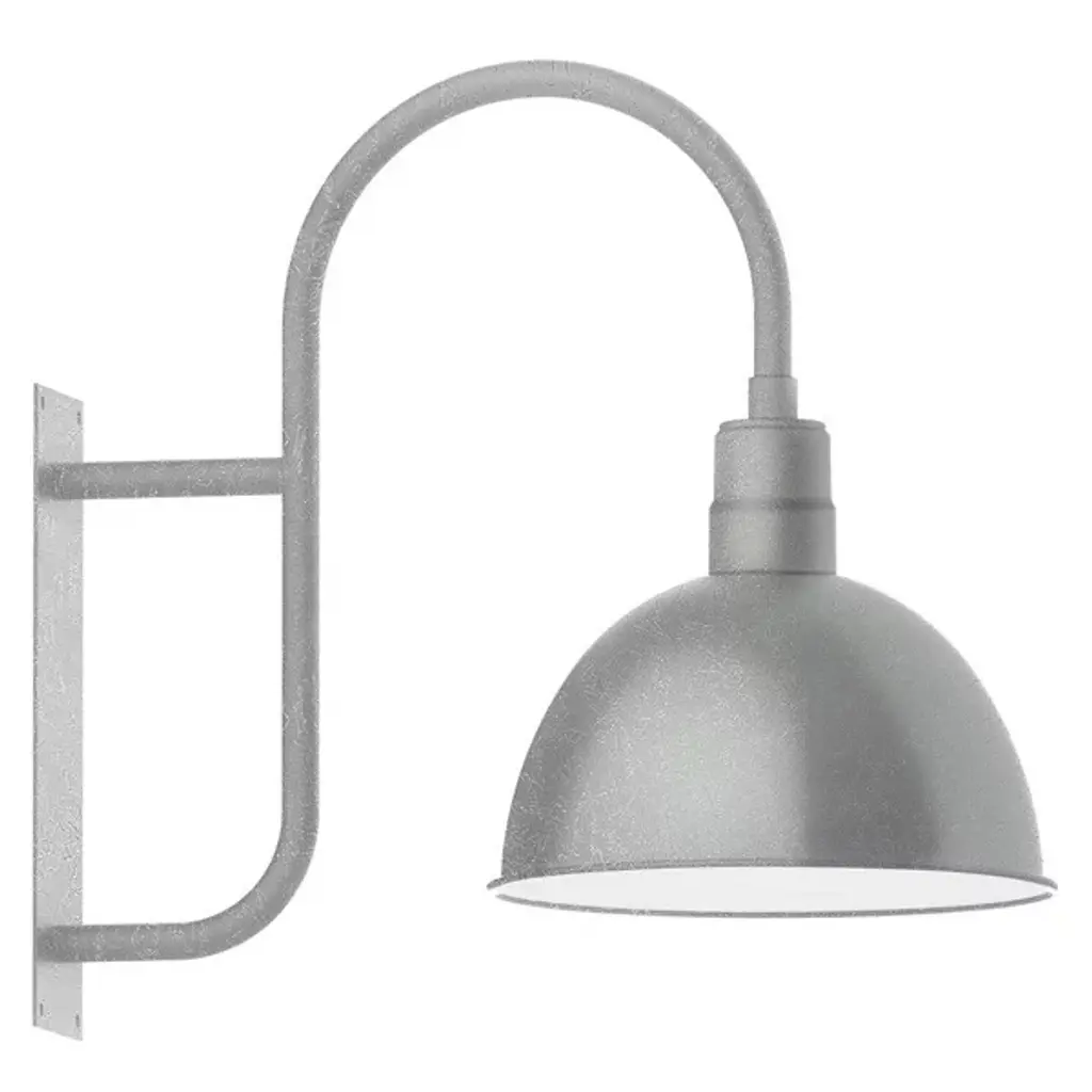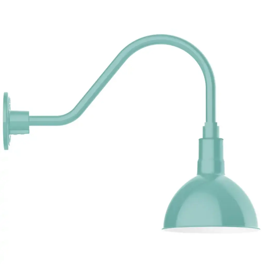 While designed for the most rugged conditions, the Rhoda Outdoor Gooseneck Wall Sconce from Alder & Ore presents itself gracefully with a gestural silhouette. It mounts securely to the wall with a large yet low-profile backplate. The piece leans forward in a familiar and always charming gooseneck arm. The extension and direction of the arm make the piece a great choice over a barn or garage door. Perched at the end, a dome shade keeps the bulb away from clear view for a relaxed lighting experience. Painted on the interior with a light-diffusing color, the spun heavy-duty aluminum shade sends out a wide beam of architecture-enhancing illumination.