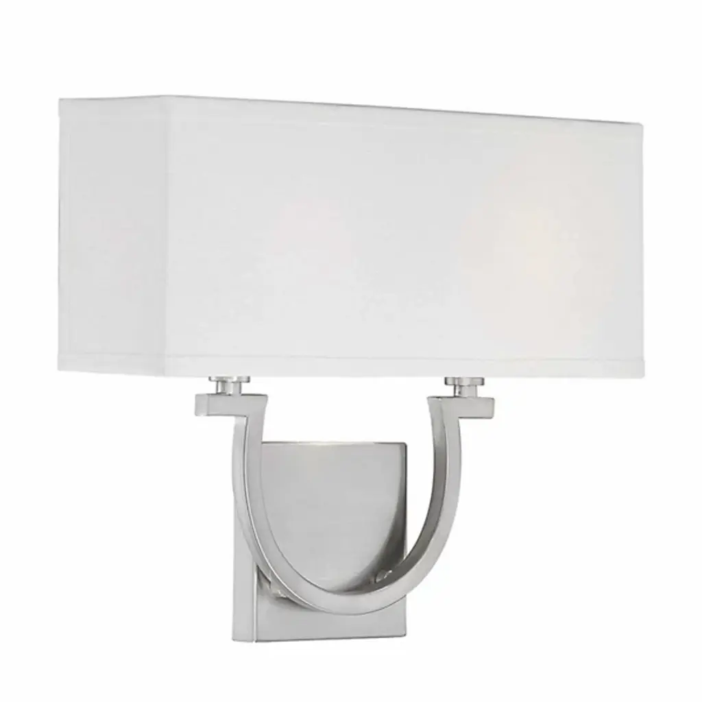 The Rhodes Wall Sconce by Savoy House is a slender, sophisticated addition to spaces. With a low-profile build, this handsome wall sconce offers plenty of illumination to a range of spaces as it filters an even layer of light through a crisp, rectangular linen shade. Anchored by a sleek, square backplate that supports an elongated, gracefully curved arm that mimics the shape of a horseshoe, this design is completed with a beautiful finish that lends it a tailored touch.