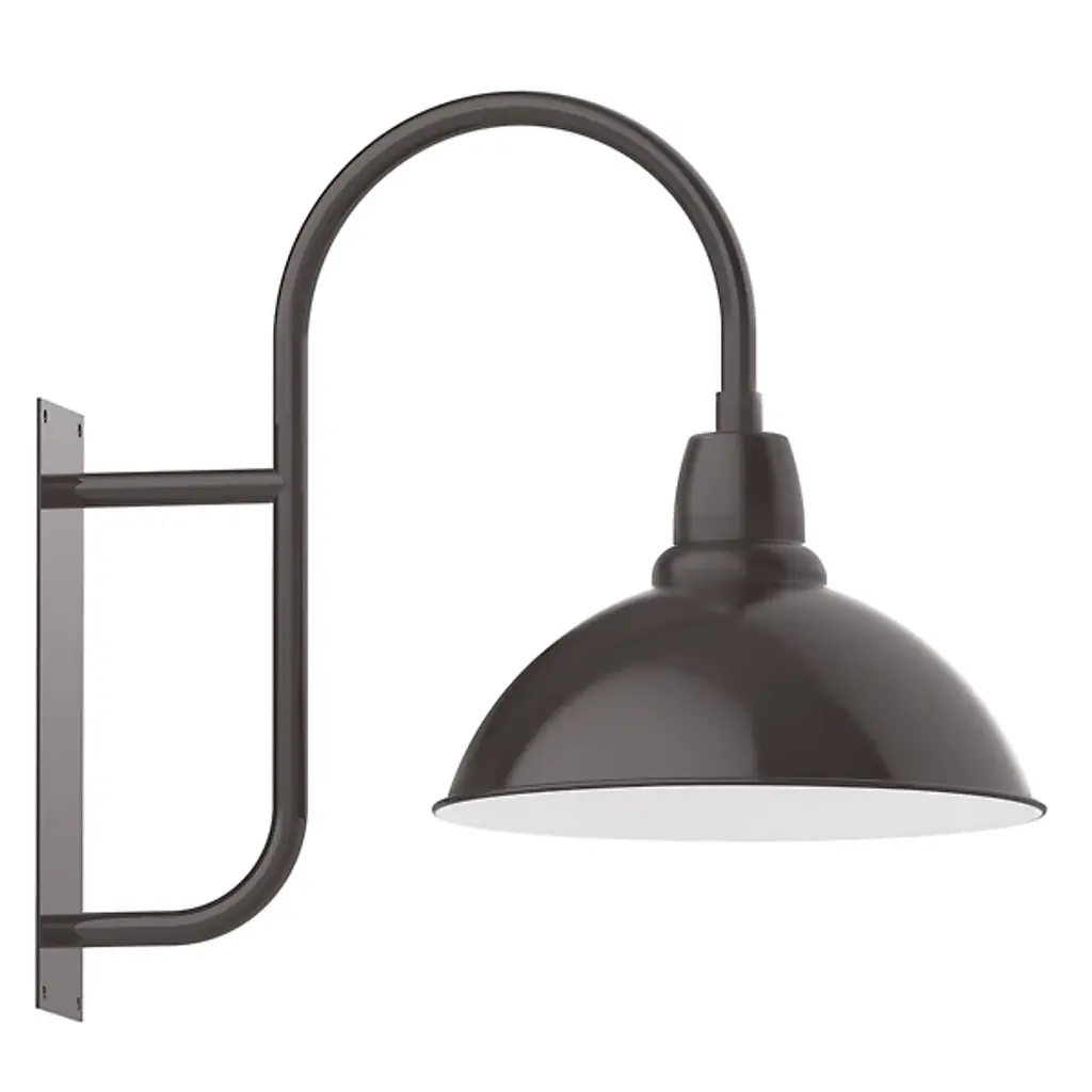 Enhance your exterior wall spaces with the smooth, sculptural lines of The Rhonda Outdoor Wall Sconce from Alder & Ore. Starting with a low-profile rectangular wall plate, it extends a slender, swooping stem supported by a short horizontal brace up and over to place a single wet-listed lamp beneath a deep bowl-shaped shade. The fixture’s structure is made from tough spun aluminum surfaced with a polyester powder coat, contrasting well with a reflective interior that scatters a bright glow below.