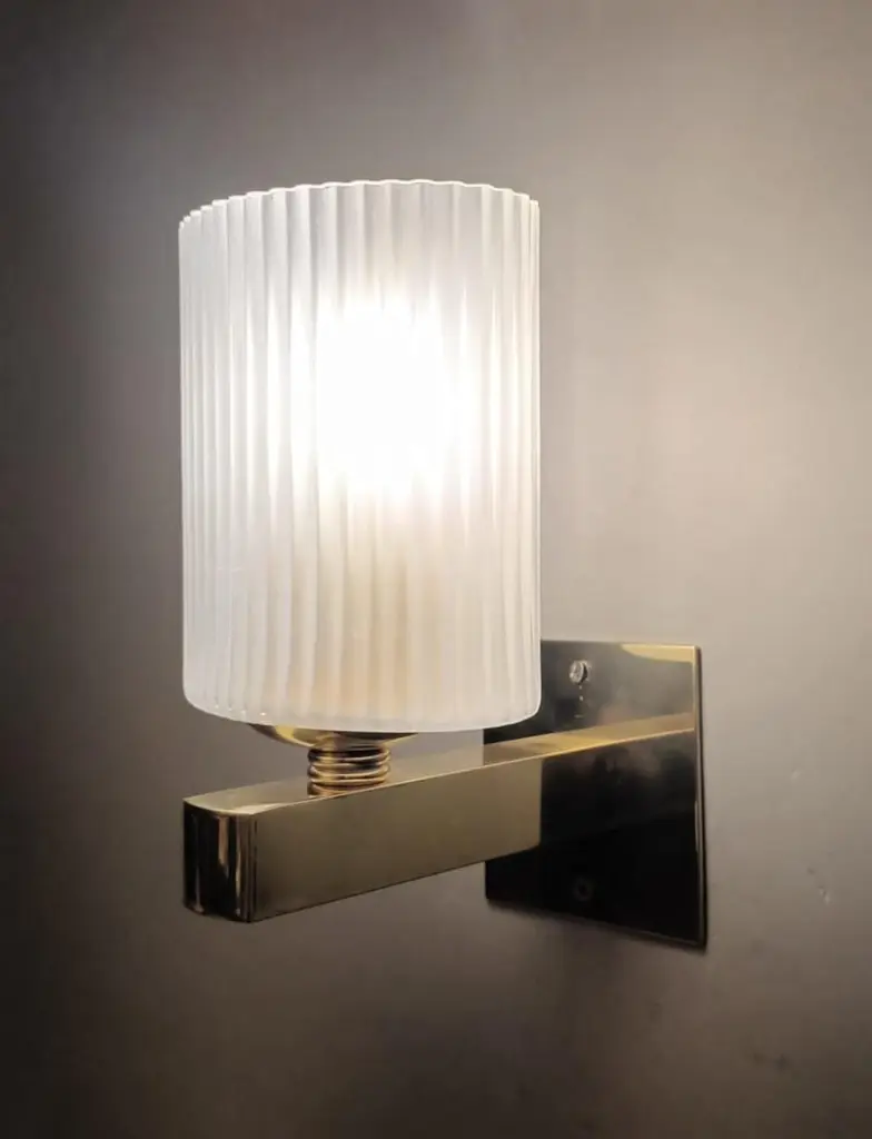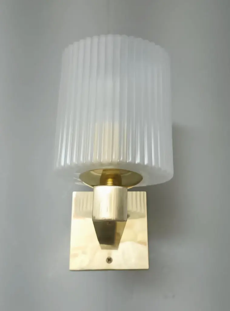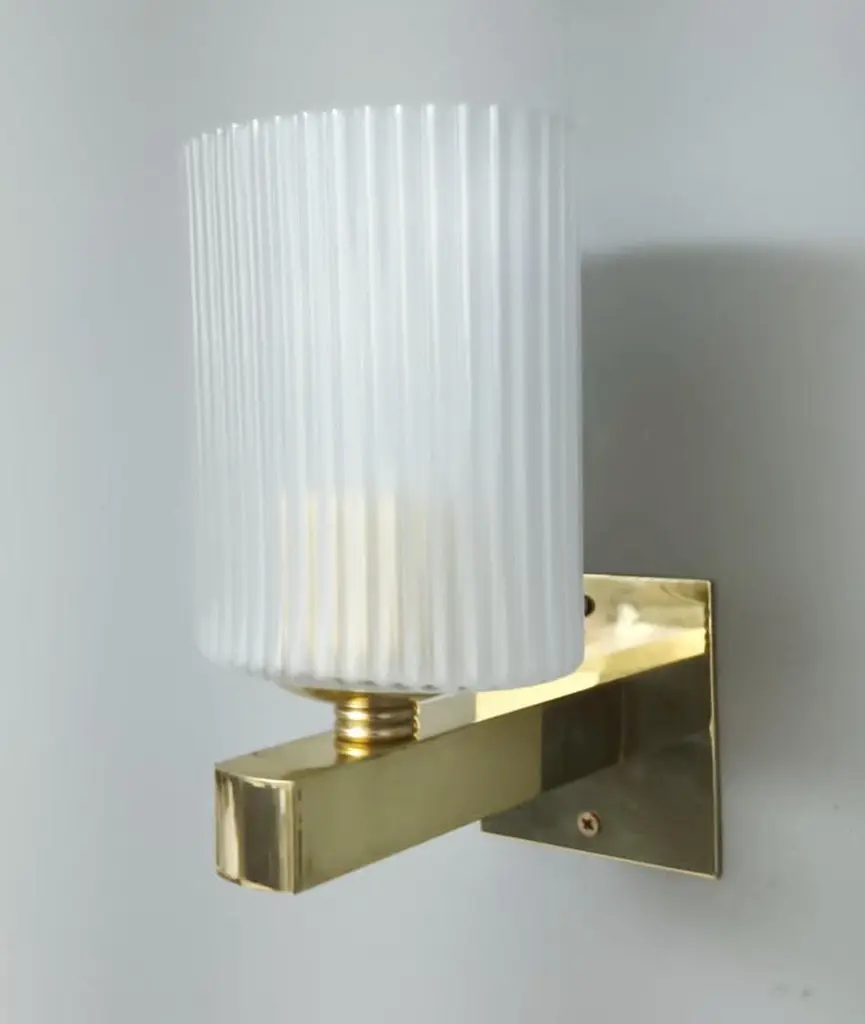 Italian wall lights with frosted white ribbed Murano glass shades mounted on brass frames / Made in Italy in the style of Barovier e Toso, circa 1950s.Measures: height 9 inches, width 5 inches, depth 6 inches, backplate width 4 inches and height 4 inches.1 light / E26 or E27 type / max 60W5 Available in stock in Italy, price is for each itemOrder reference #: FABIOLTD H110