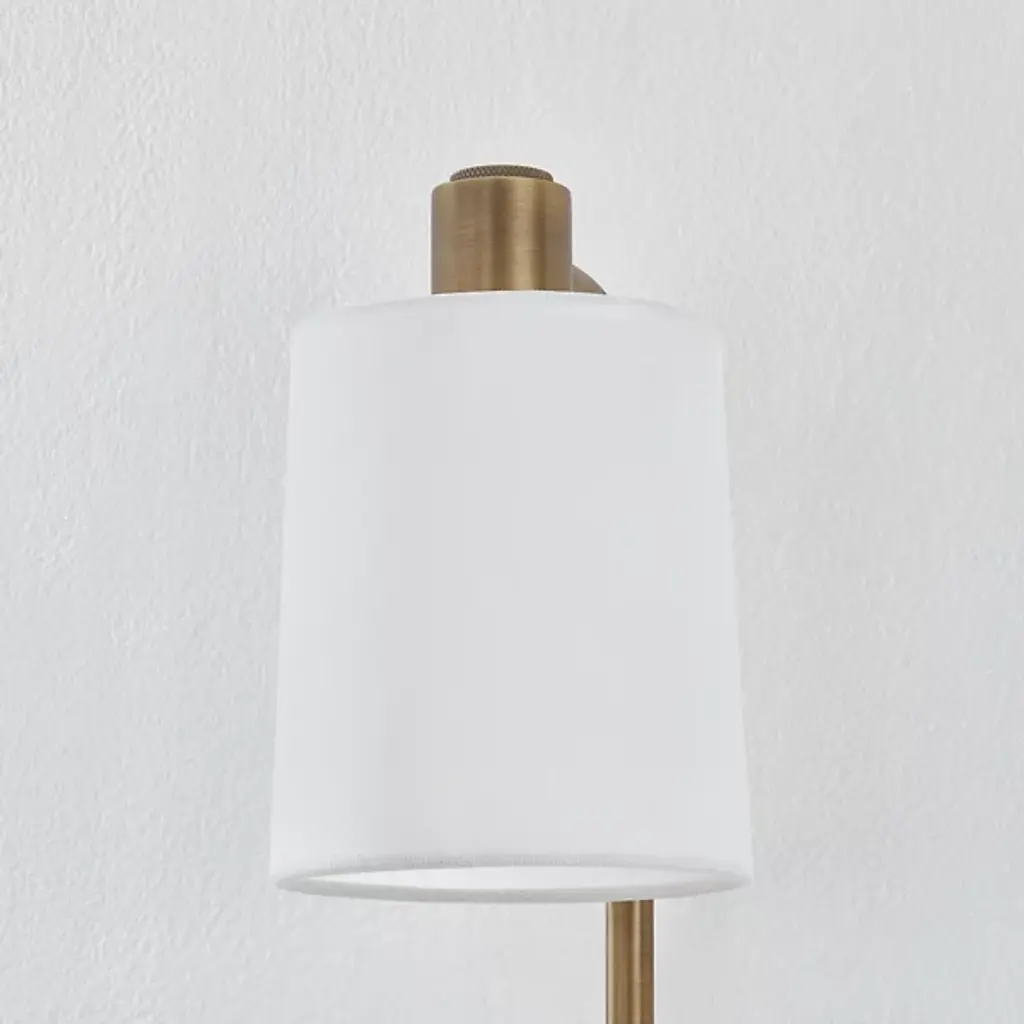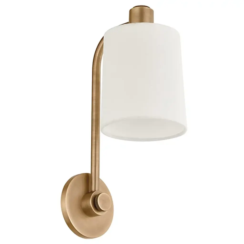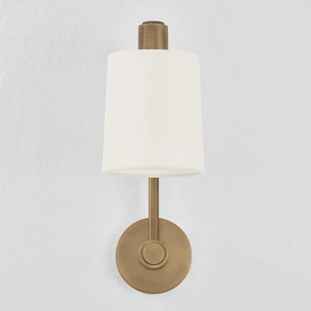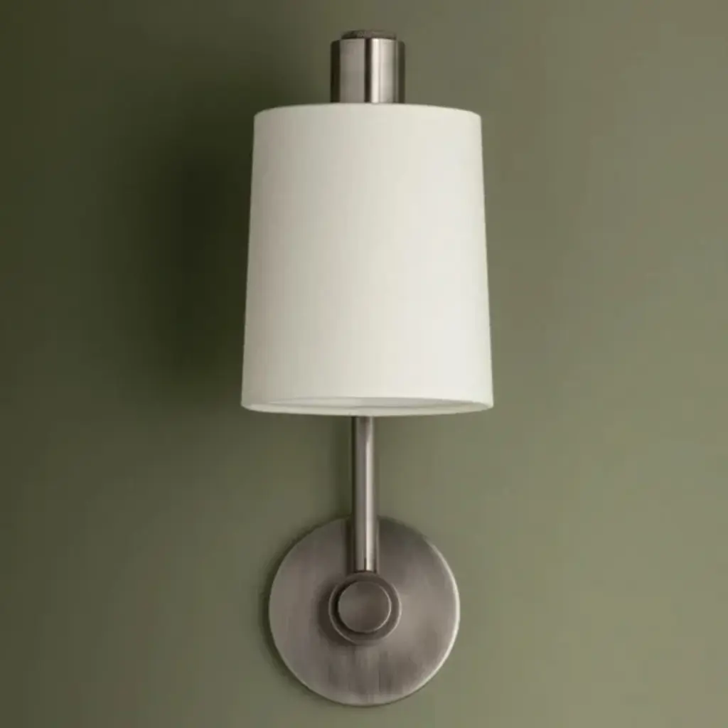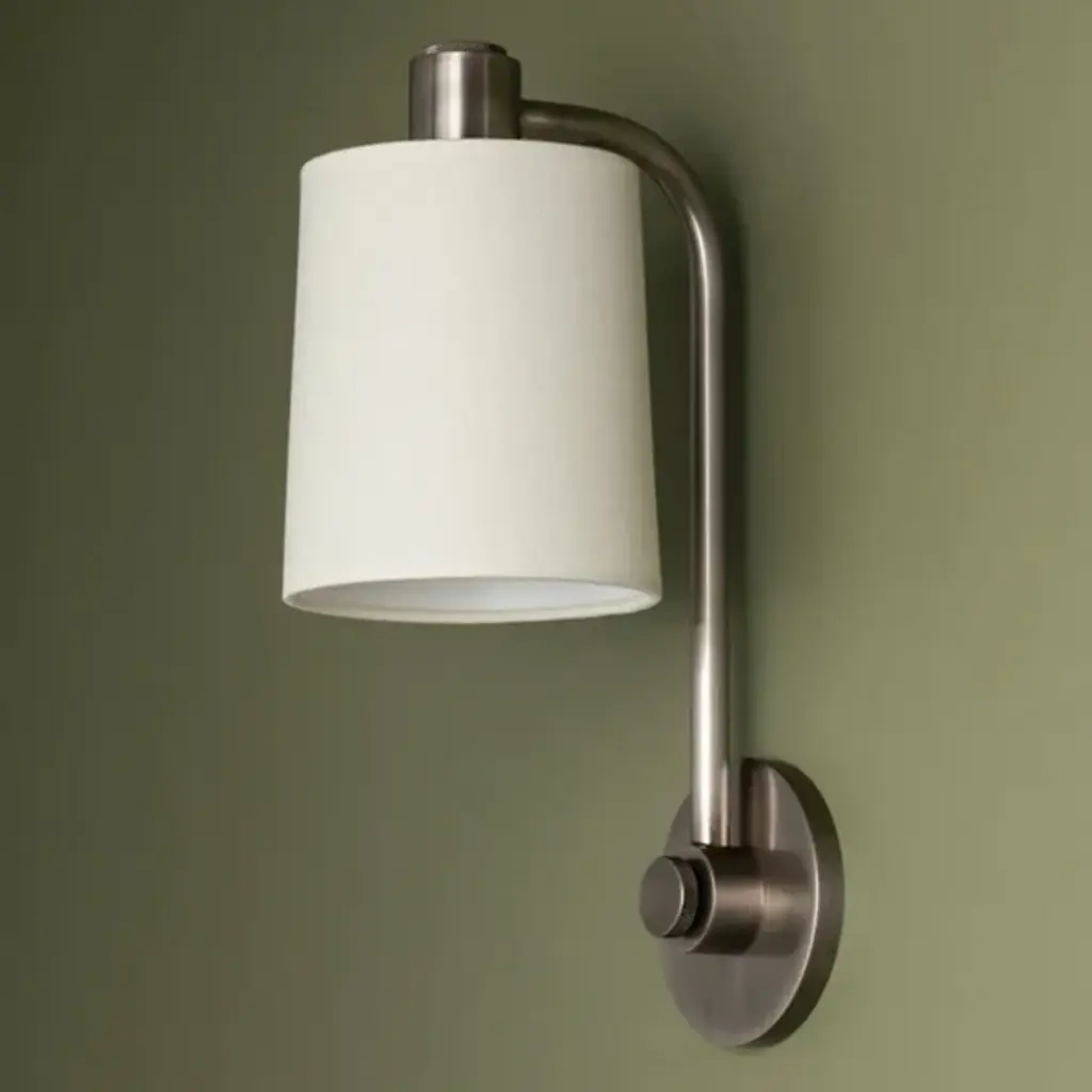 Enhance your walls with the slender lines of the Rigby Wall Sconce from Troy Lighting. This refined industrial design features a curved steel arm that supports an off-white linen drum shade, effortlessly blending hard and soft elements while becoming essential to its environment. The light source casts both downlighting and wall light, with elements of minimalist style able to complement the transitional decor. Damp-listed and able to go anywhere, Rigby adds welcome sophistication to any room.
