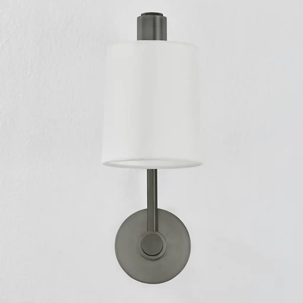 Enhance your walls with the slender lines of the Rigby Wall Sconce from Troy Lighting. This refined industrial design features a curved steel arm that supports an off-white linen drum shade, effortlessly blending hard and soft elements while becoming essential to its environment. The light source casts both downlighting and wall light, with elements of minimalist style able to complement the transitional decor. Damp-listed and able to go anywhere, Rigby adds welcome sophistication to any room.