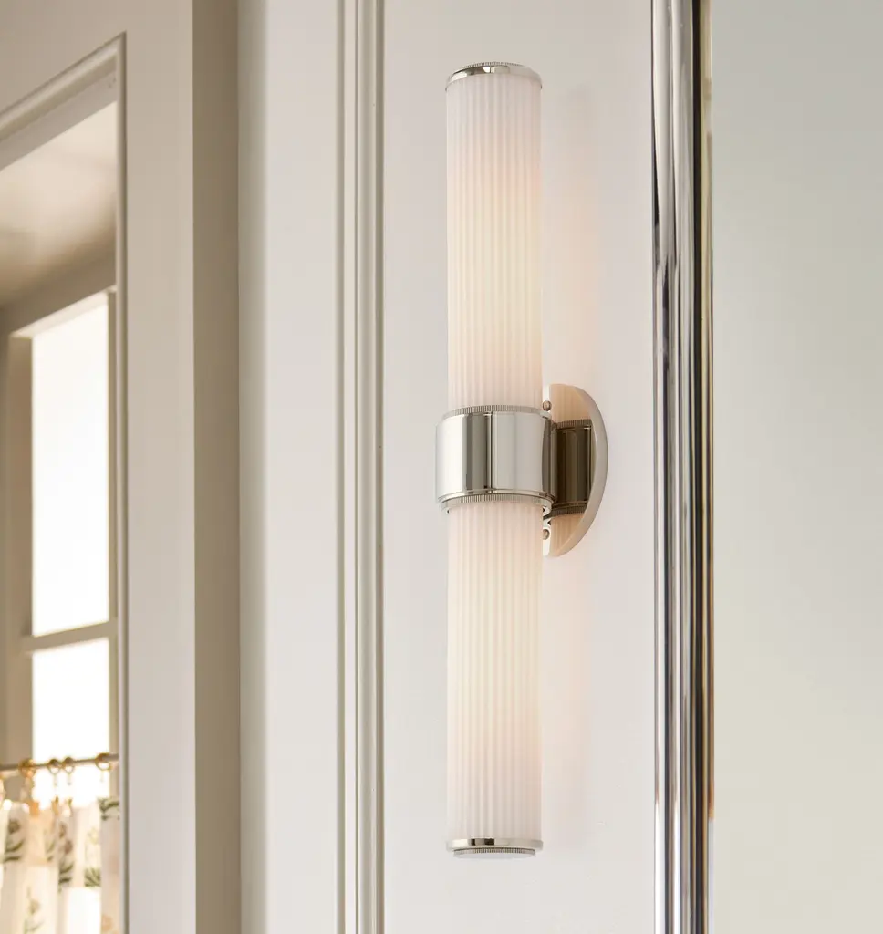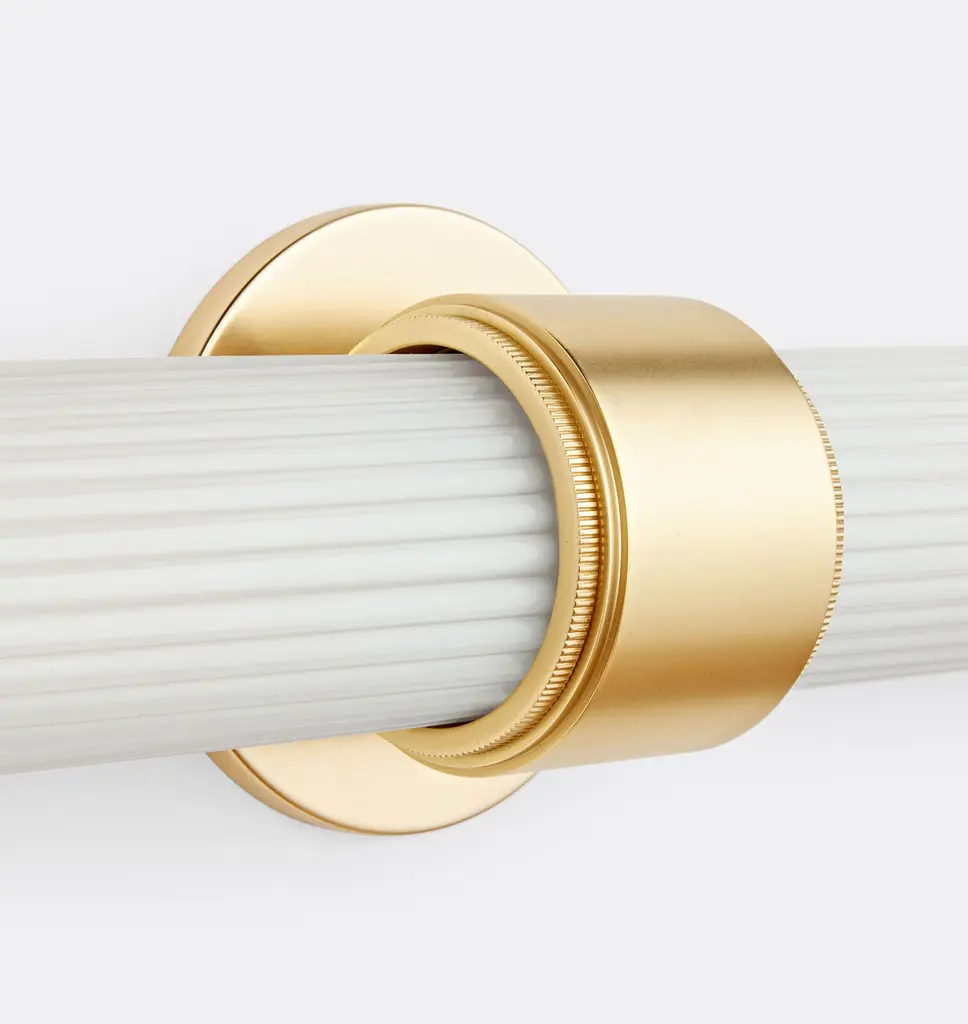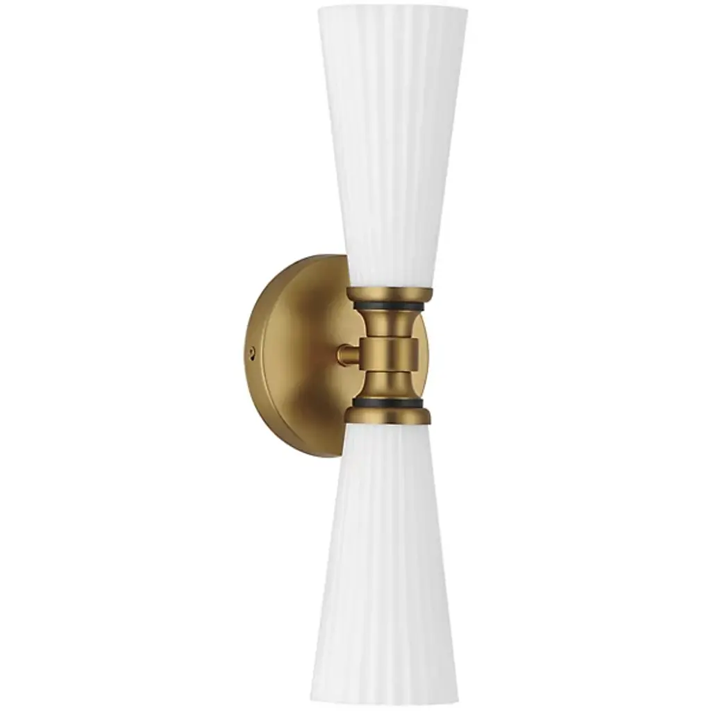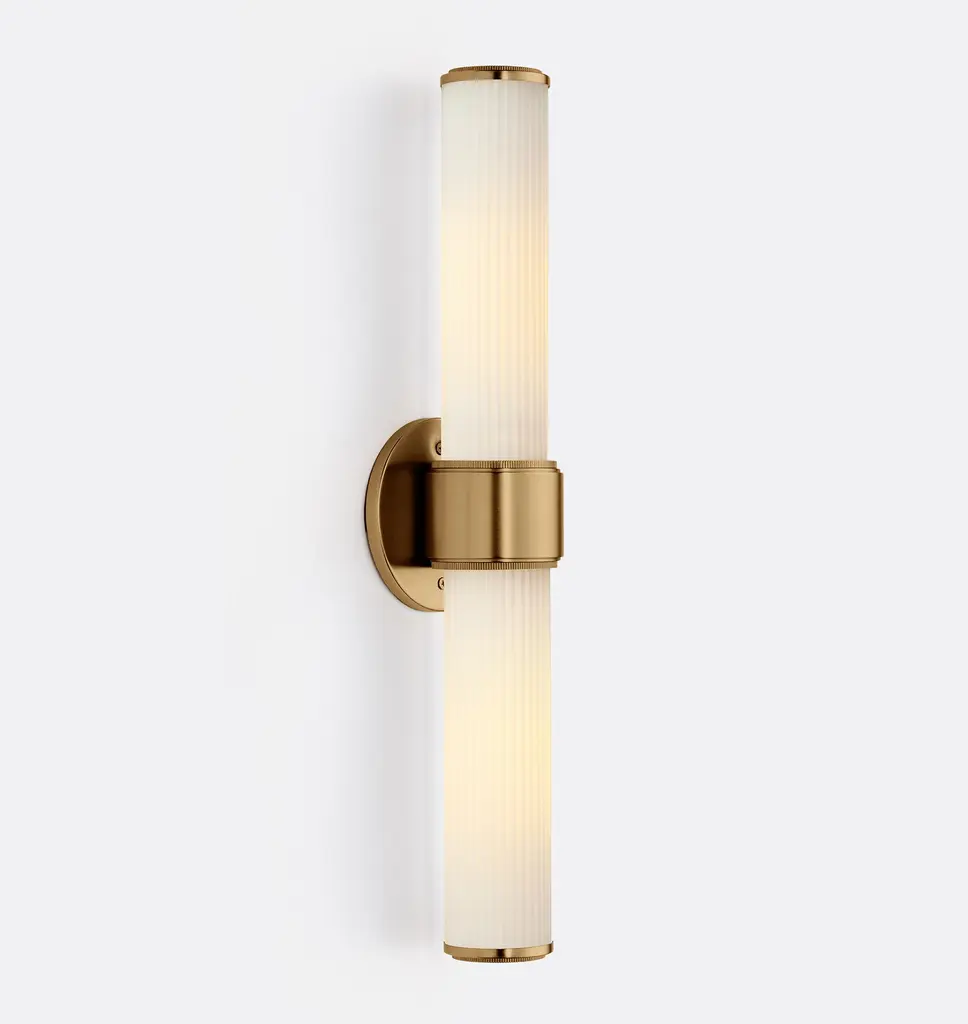 Simple yet textural, the Rigdon Double Wall Sconce highlights its elegance through attention to detail. Featuring a unique coining detail, Rigdon is available as both a single and double sconce, with opal glass and brass construction.