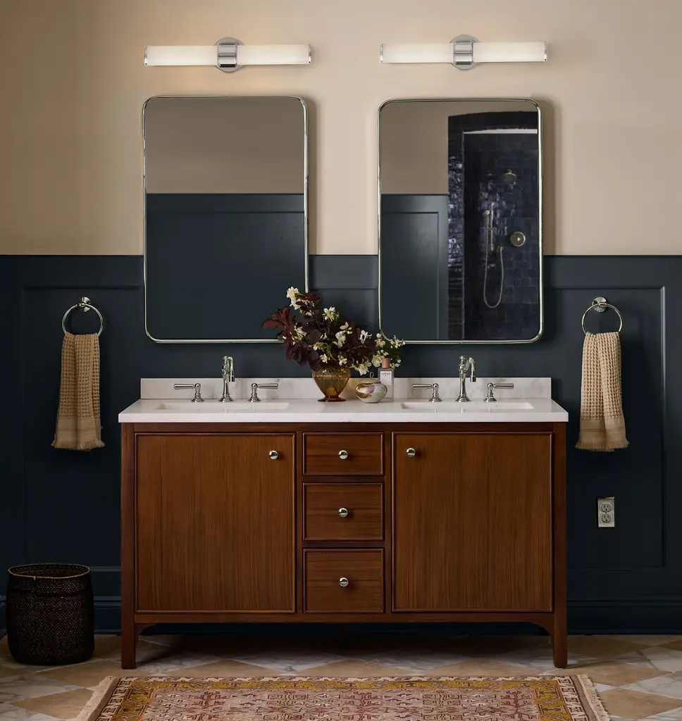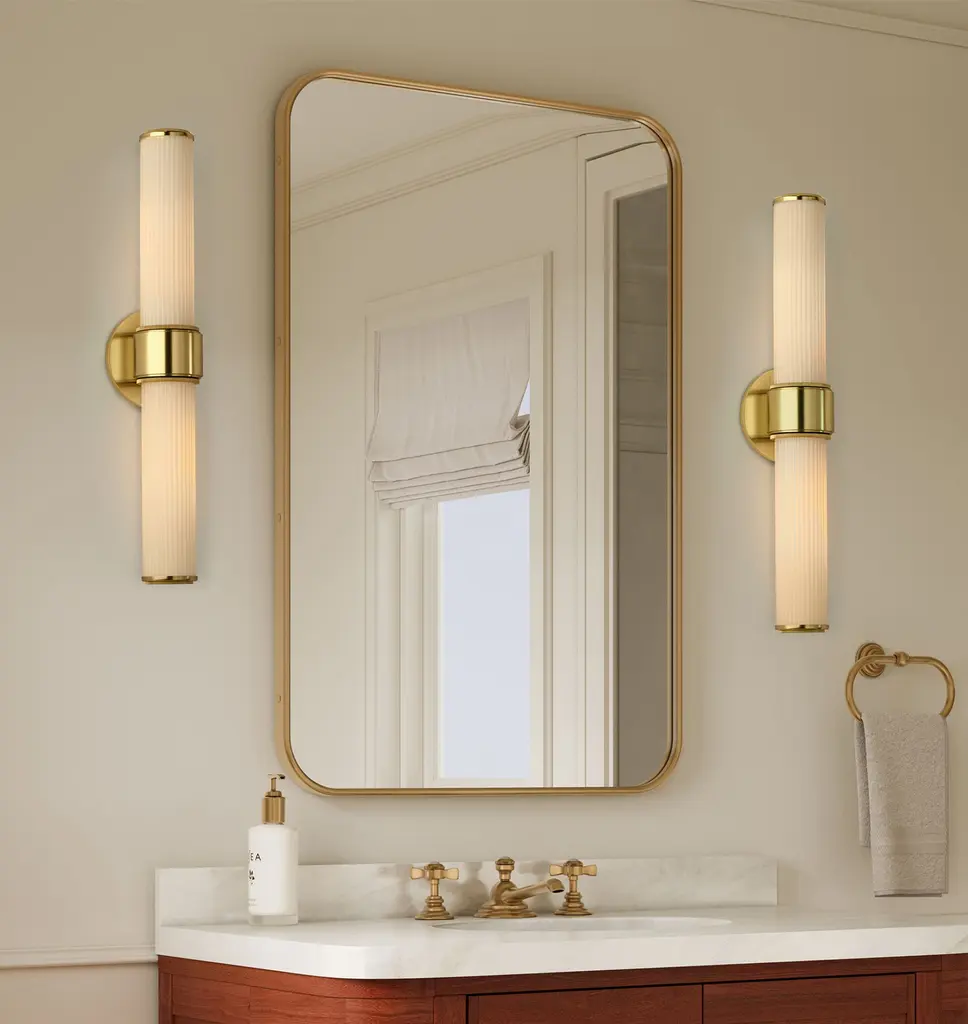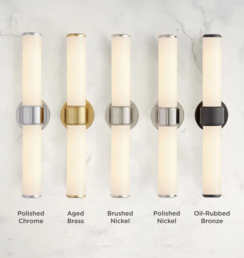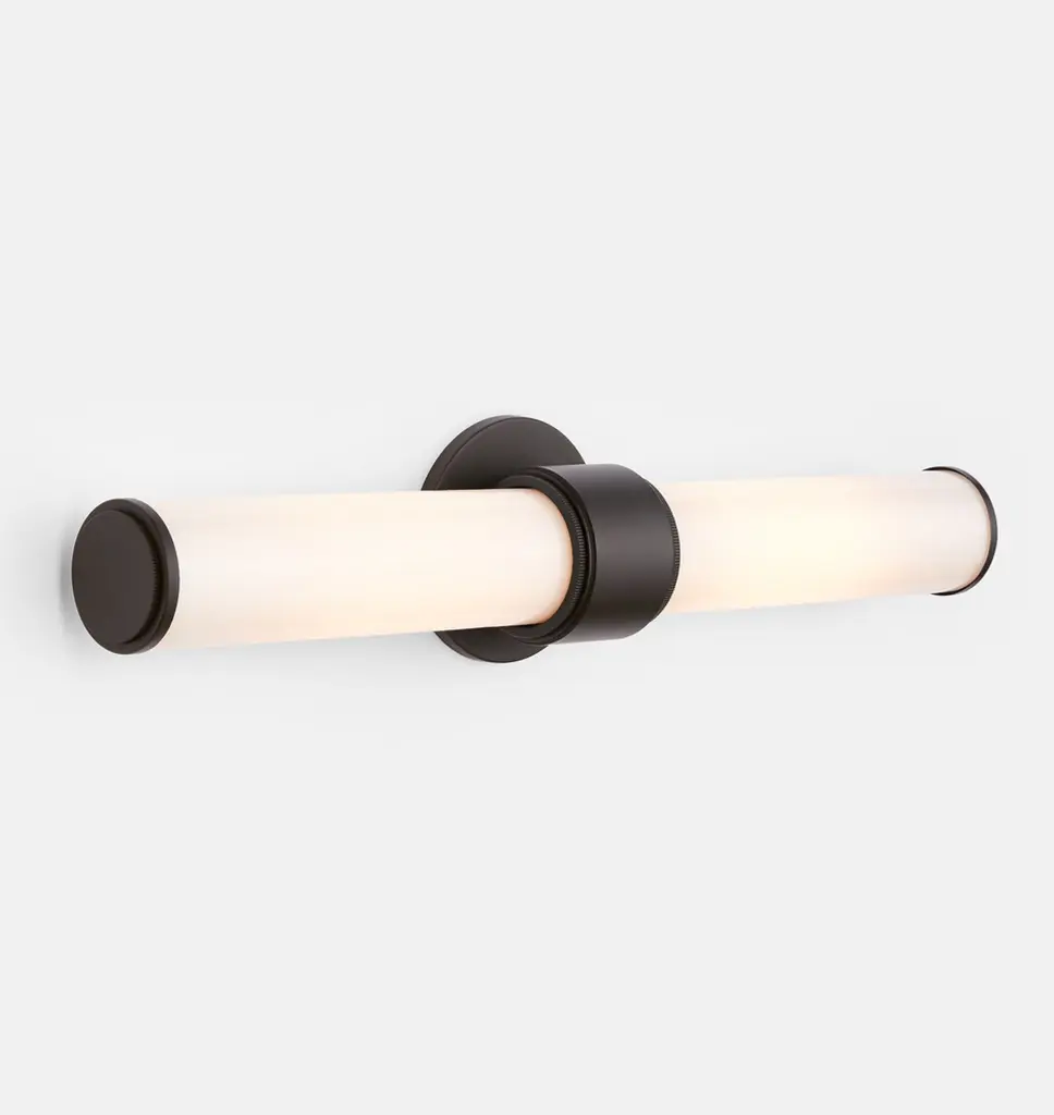 Simple yet textural, the Rigdon Double Wall Sconce highlights its elegance through attention to detail. Featuring a unique coining detail, Rigdon is available as both a single and double sconce, with opal glass and brass construction.