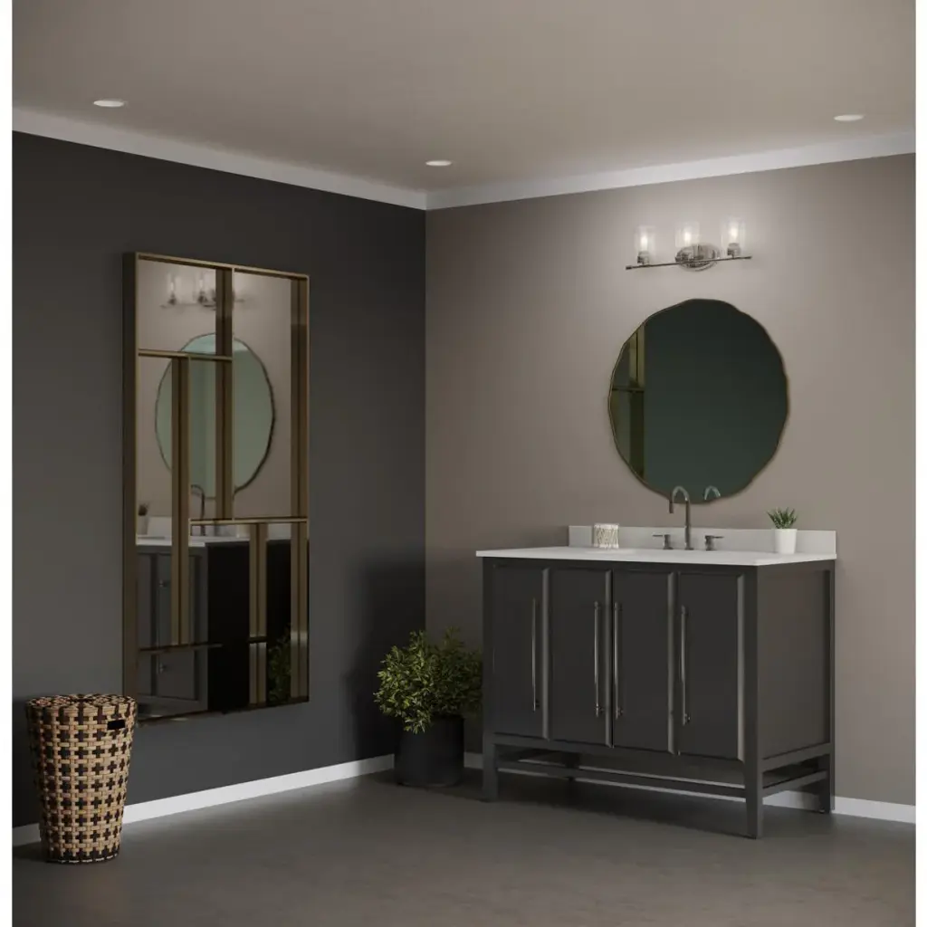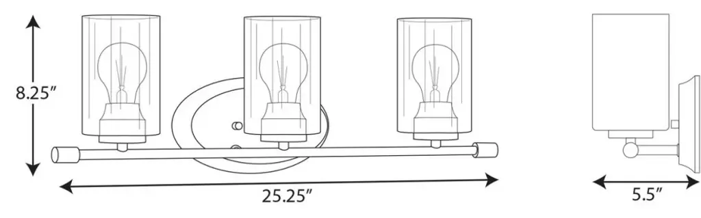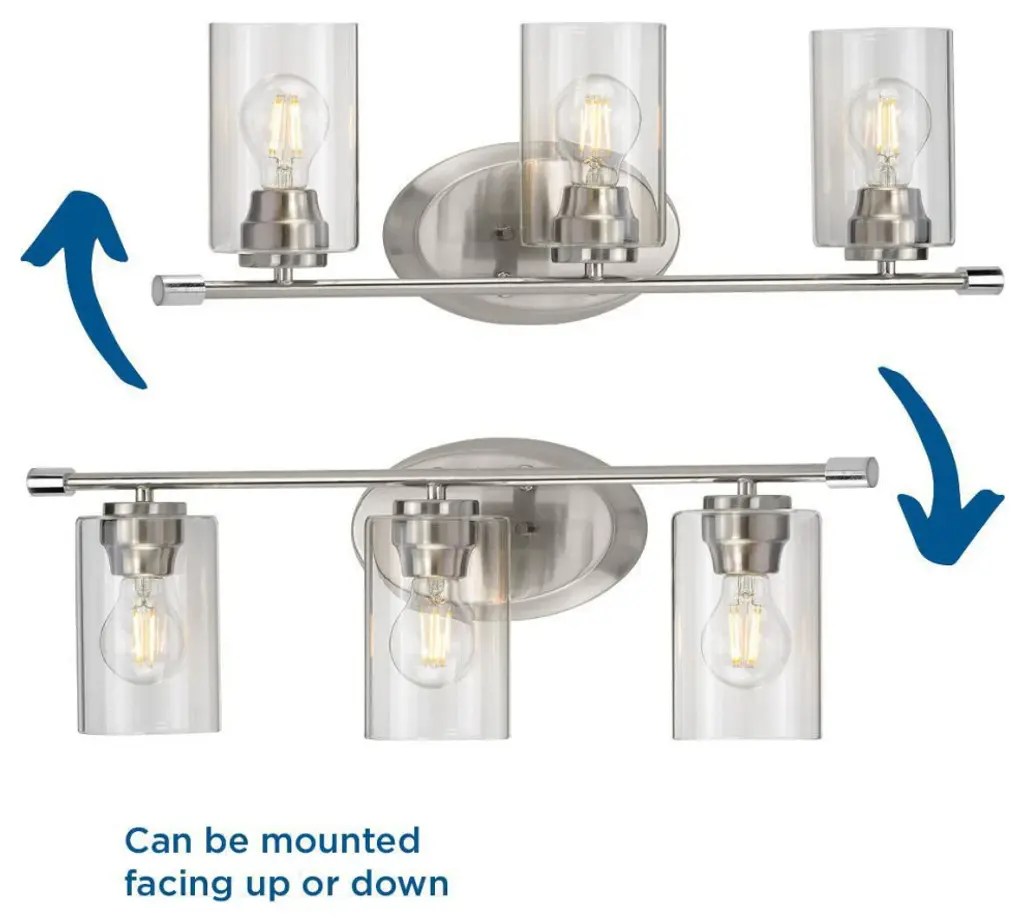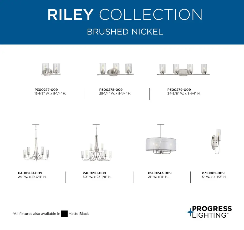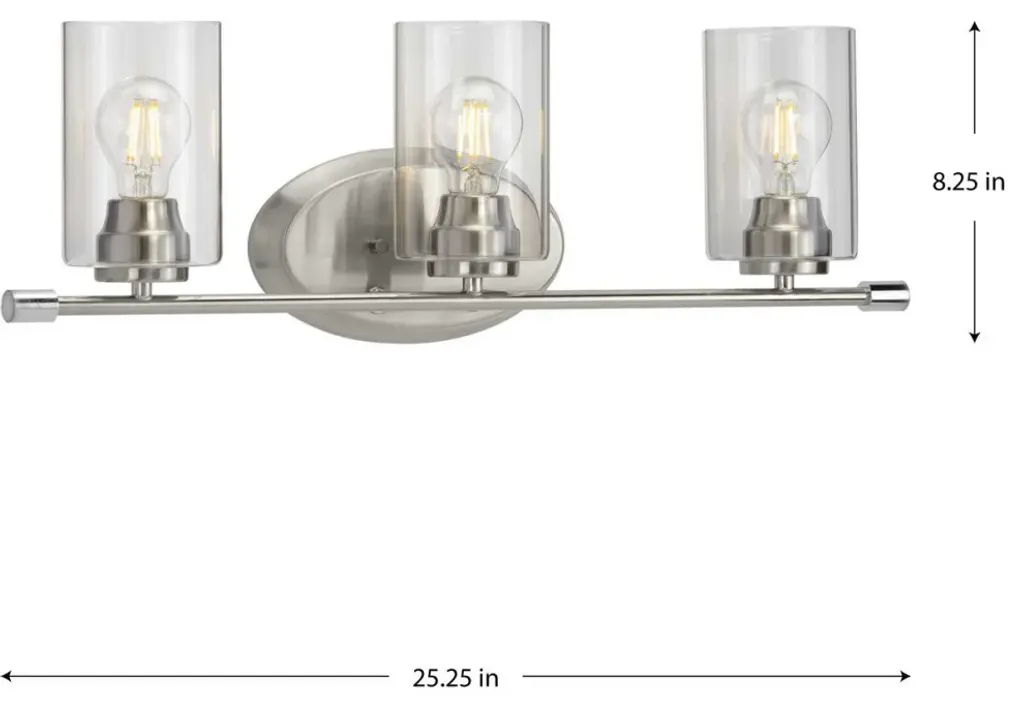 Incorporate a sleek simplicity and natural beauty with the Riley Collection''s Three-Light Brushed Nickel Bath. Clear glass shades offer rejuvenating illumination. The shades rest on a gorgeous brushed nickel frame with polished chrome finials for an over all design that exudes a feeling of tranquility and serenity. Ideal for any bathroom in new traditional or contemporary settings.Bulb Type: IncandescentBulb Wattage: 60 WBulb Included: NNumber of Bulbs: 3
