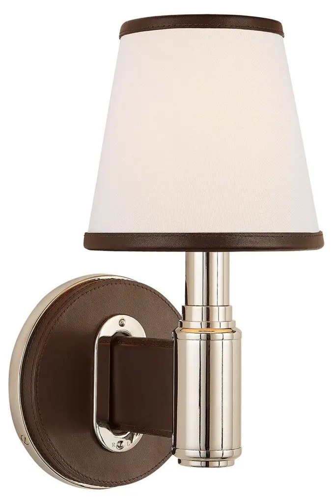 This sconce is crafted of brass with leather accents and a matching trim on its empire shade.