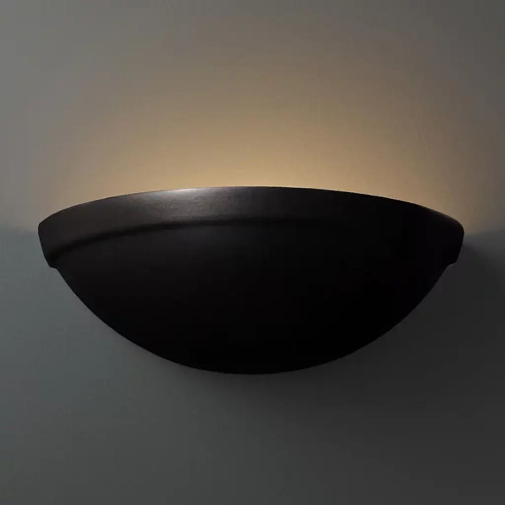 The Rimmed Quarter Sphere Wall Sconce by Justice Design Group is a big bowlful of light for larger modern interiors. This quarter sphere shaped sconce is molded by hand using Ceramic, and it's crafted with a wide top opening in order to provide the most uplight possible. The amount of light that's cast makes quick work of accenting the upper part of a wall and/or ceiling; it's also a great option for when an interior design requires an out-of-the-way secondary ambient light source. The detail of the raised rim finishes the piece and gives the otherwise understated bowl a more decorative and substantial look.