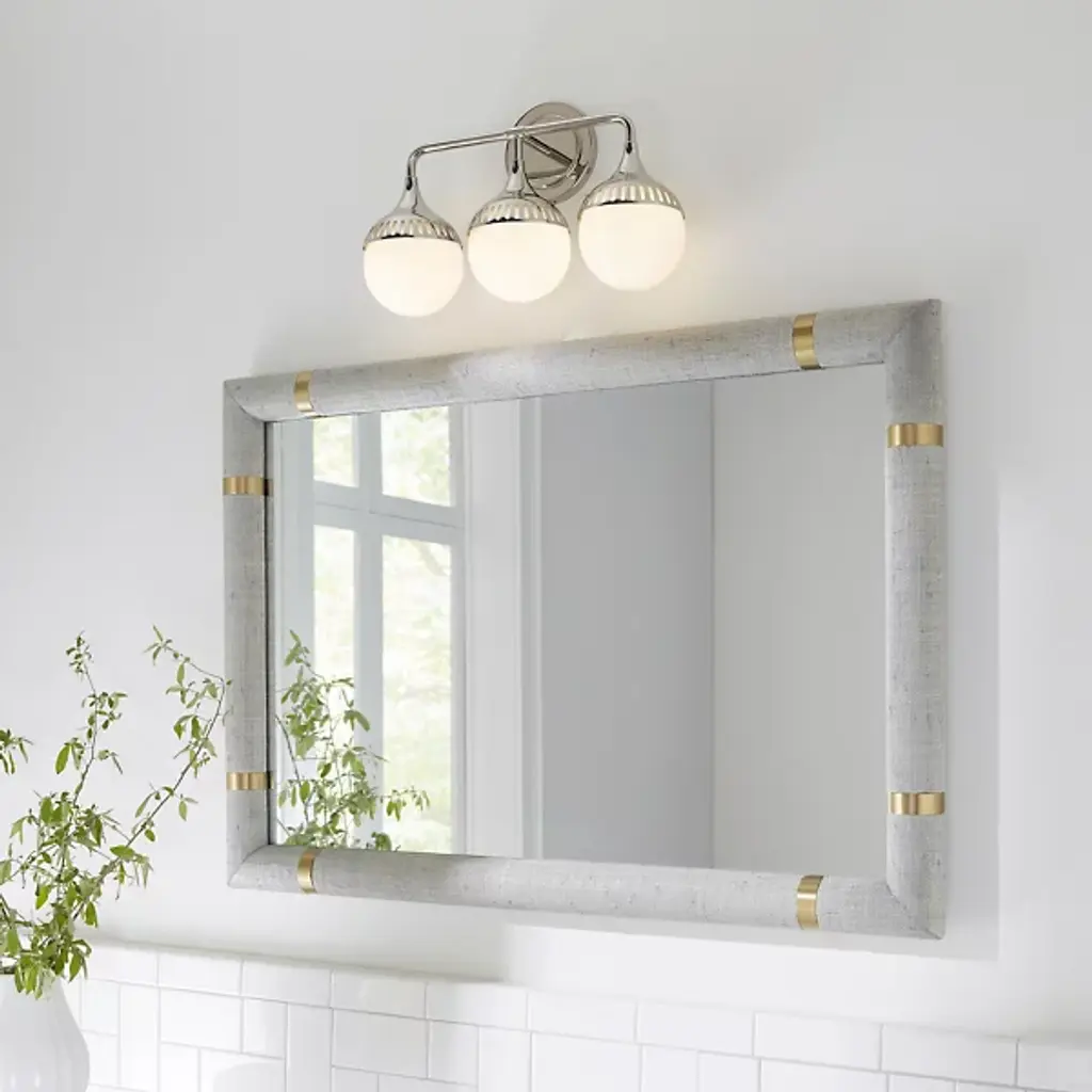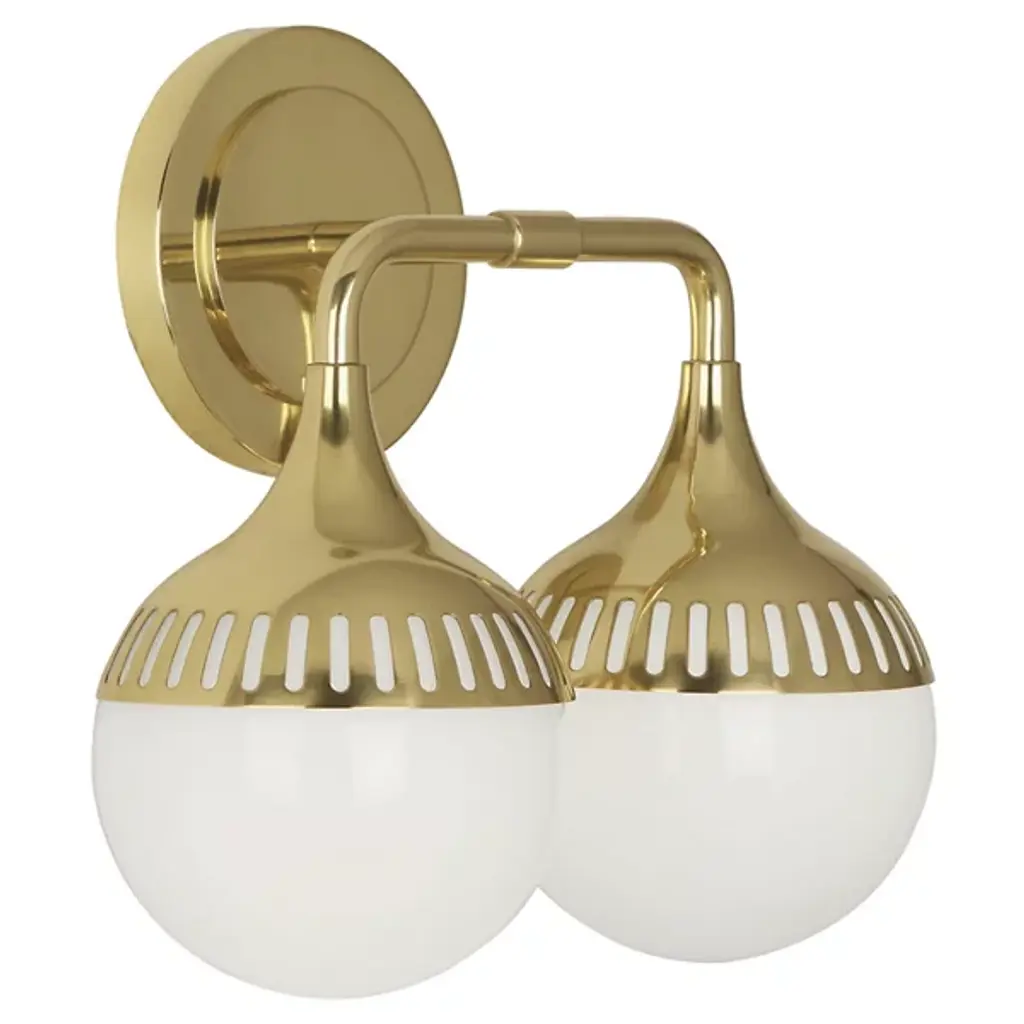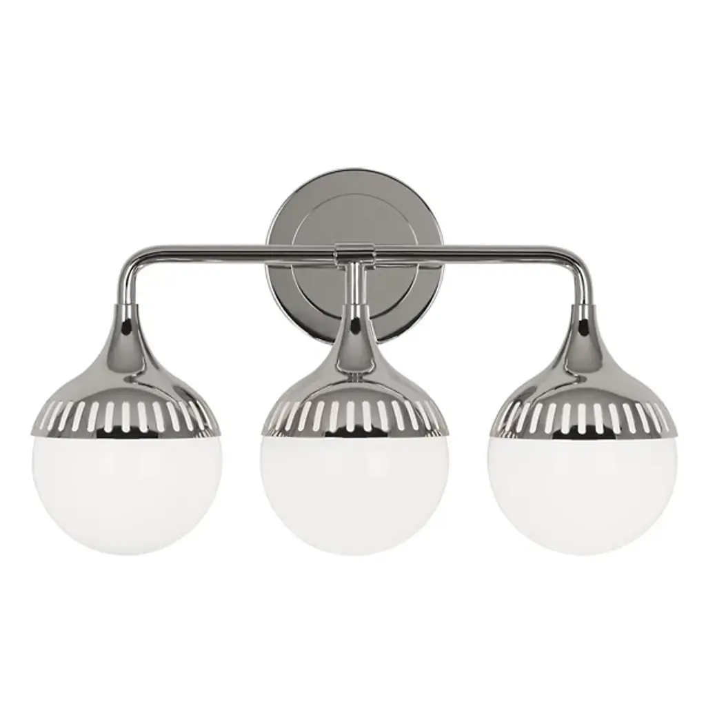Spruce up the retro-modern personality of the bathroom while treating your reflection in the mirror to the uniform glow of the Rio Wall Sconce A compact circular wall mount gives this piece a spot in tight spaces. The contrast between the shiny metal hardware and the milky glass evokes mid-century styling. The hanging lamp holders and the glass shade combine as charming water drop shapes. Crisp laser-cut details of the holders use the bright glass behind to produce a graphic silhouette. Glare-free light pouring out the base of the glass exits as soft, even illumination.
