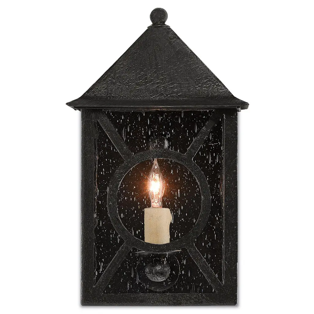 The small version of the Ripley Outdoor Wall Sconce is one of twelve fixtures in our Twelfth Street collection of outdoor lighting that features a Trilux finish, the next generation of high-performance, weather-resistant finishing technology brought to the market exclusively by Currey & Company. The coating provides three levels of protection, and is fade resistant, crack resistant and rust resistant. We guarantee the finishes applied to our Twelfth Street pieces for five years. The metal on this sconce in the collection has been treated to our midnight finish that surrounds seeded-glass panes that turn the illumination to a soft glow behind the geometric detailing.