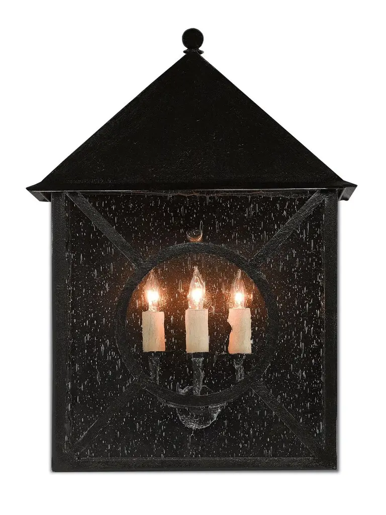 An outdoor sconce in the shape of a house: What could be more charming? Seeded glass adds unexpected depth and intrigue. The high-performance finish of the wrought iron resists rust, cracking, and fading. Hardwired.