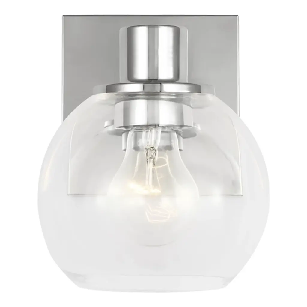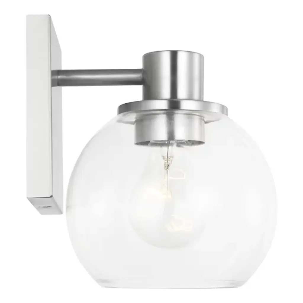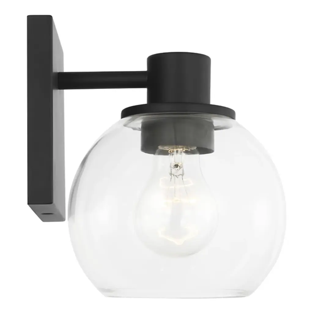 The Rito Bath Wall Sconce from Generation Lighting updates the familiar globe light through contemporary detailing and material choices. The clear glass sphere sits within a metal housing that provides structural support while maintaining the classic globe silhouette. This sconce can be mounted with the globe facing upward or downward to accommodate different lighting needs. The transparent glass allows for complete visibility of the bulb within, making lamp selection an integral part of the overall design aesthetic and supporting dimming capabilities for varied light levels.