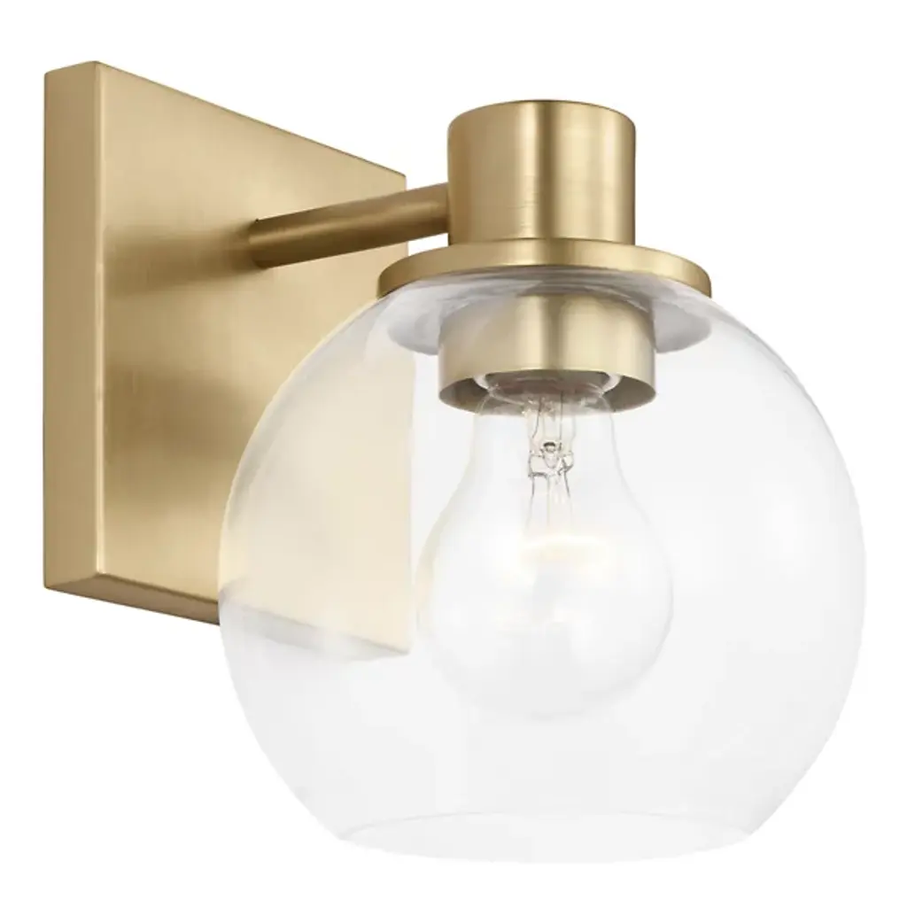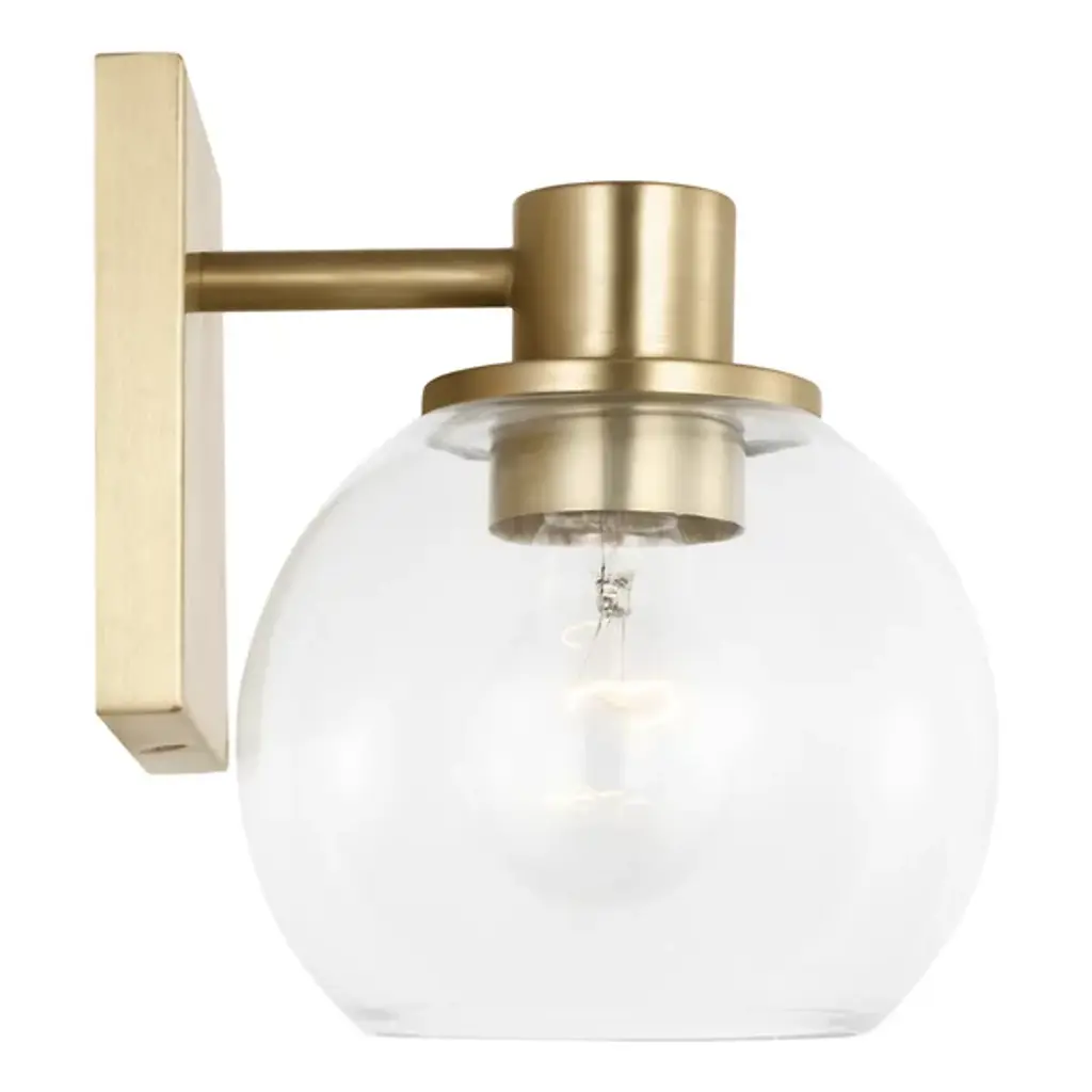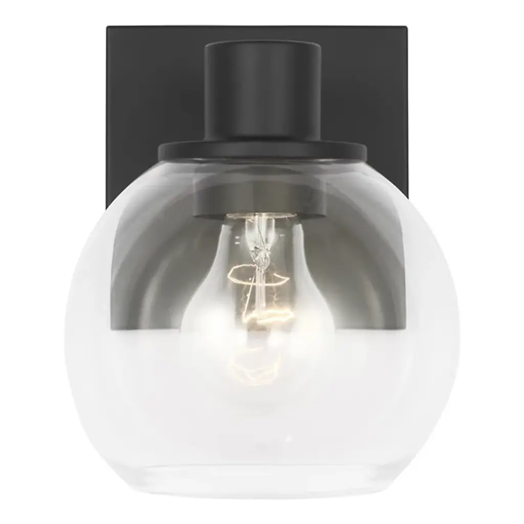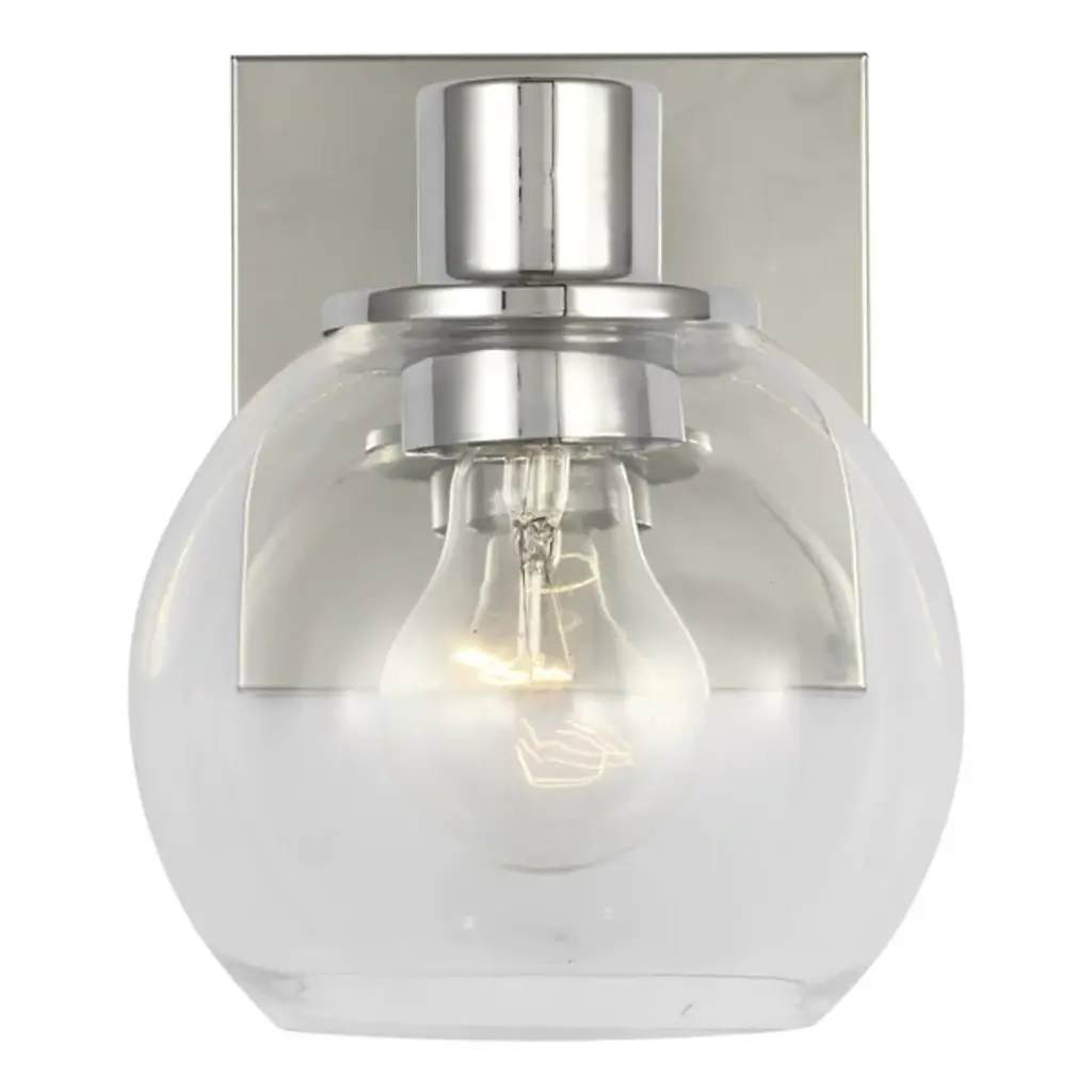 The Rito Bath Wall Sconce from Generation Lighting updates the familiar globe light through contemporary detailing and material choices. The clear glass sphere sits within a metal housing that provides structural support while maintaining the classic globe silhouette. This sconce can be mounted with the globe facing upward or downward to accommodate different lighting needs. The transparent glass allows for complete visibility of the bulb within, making lamp selection an integral part of the overall design aesthetic and supporting dimming capabilities for varied light levels.