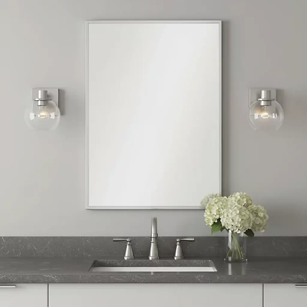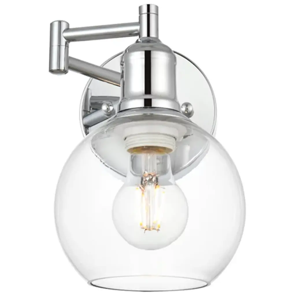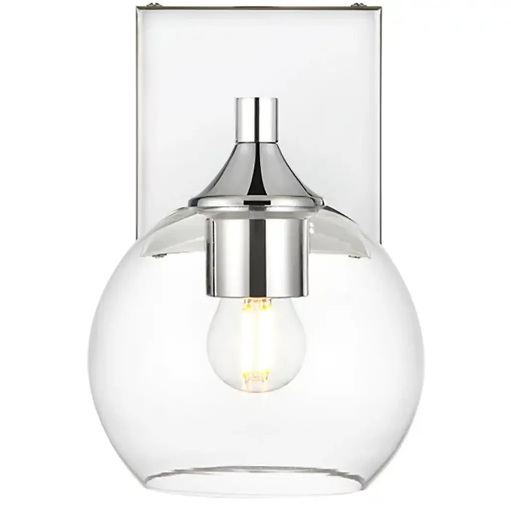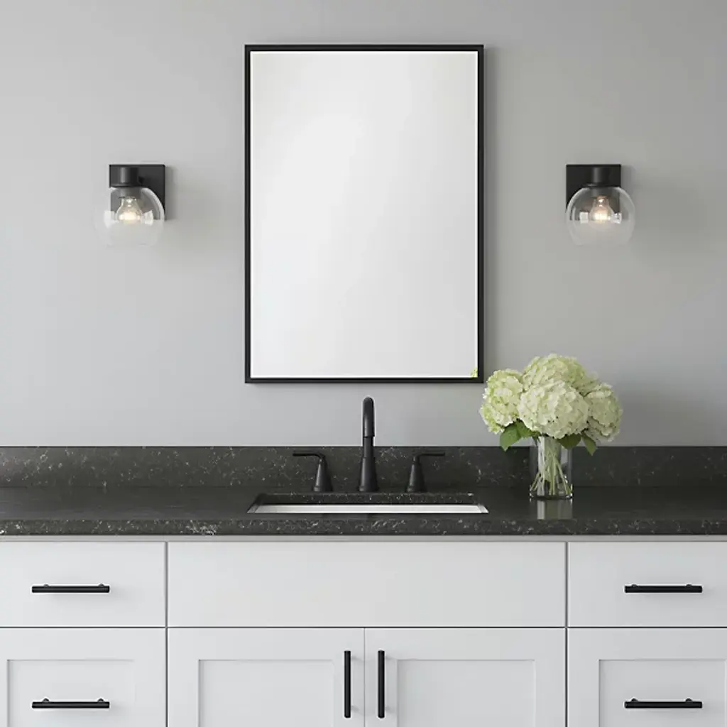 The Rito Bath Wall Sconce from Generation Lighting updates the familiar globe light through contemporary detailing and material choices. The clear glass sphere sits within a metal housing that provides structural support while maintaining the classic globe silhouette. This sconce can be mounted with the globe facing upward or downward to accommodate different lighting needs. The transparent glass allows for complete visibility of the bulb within, making lamp selection an integral part of the overall design aesthetic and supporting dimming capabilities for varied light levels.