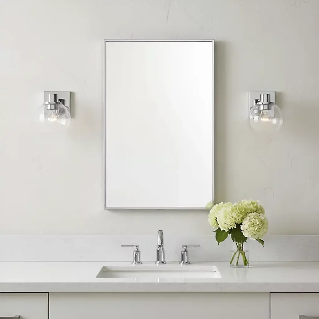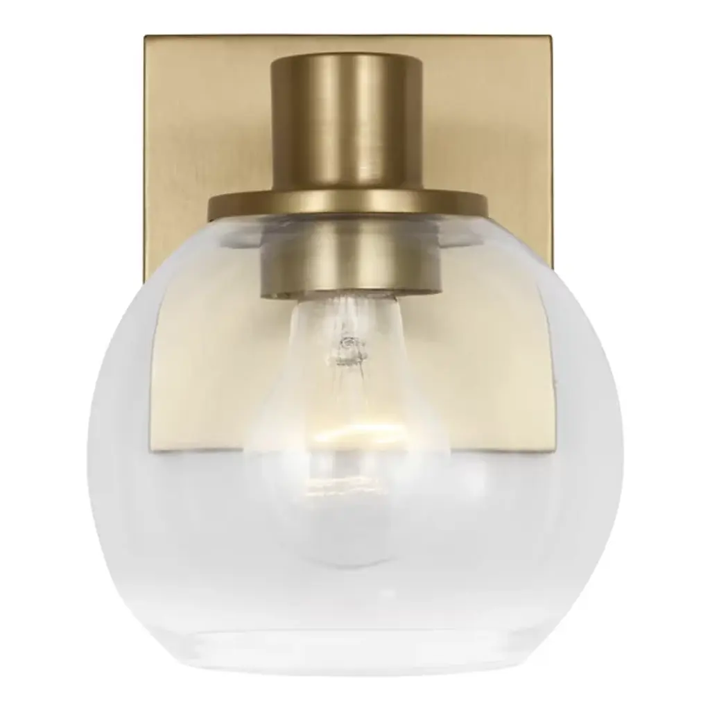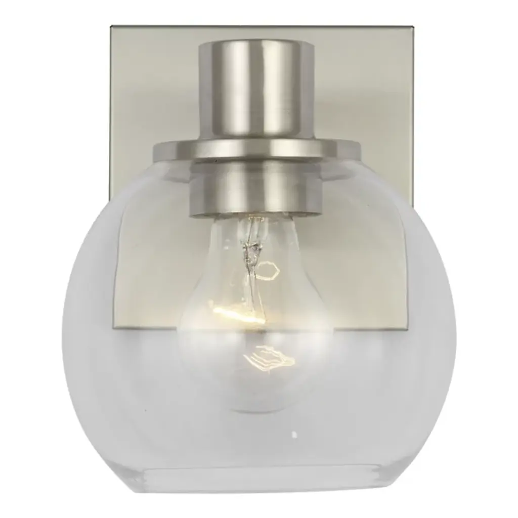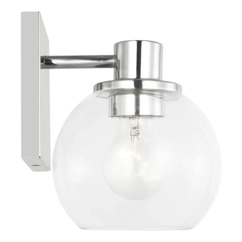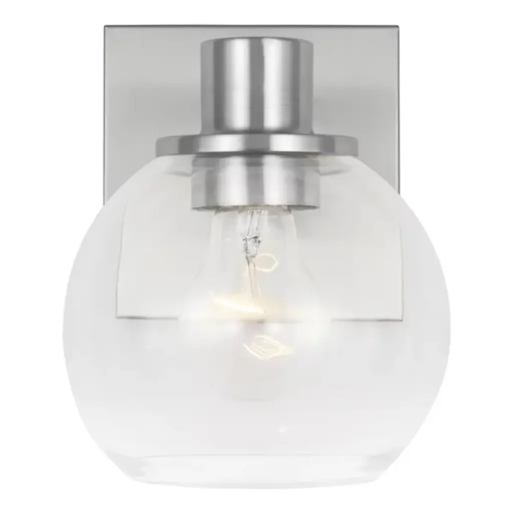 The Rito Bath Wall Sconce from Generation Lighting updates the familiar globe light through contemporary detailing and material choices. The clear glass sphere sits within a metal housing that provides structural support while maintaining the classic globe silhouette. This sconce can be mounted with the globe facing upward or downward to accommodate different lighting needs. The transparent glass allows for complete visibility of the bulb within, making lamp selection an integral part of the overall design aesthetic and supporting dimming capabilities for varied light levels.