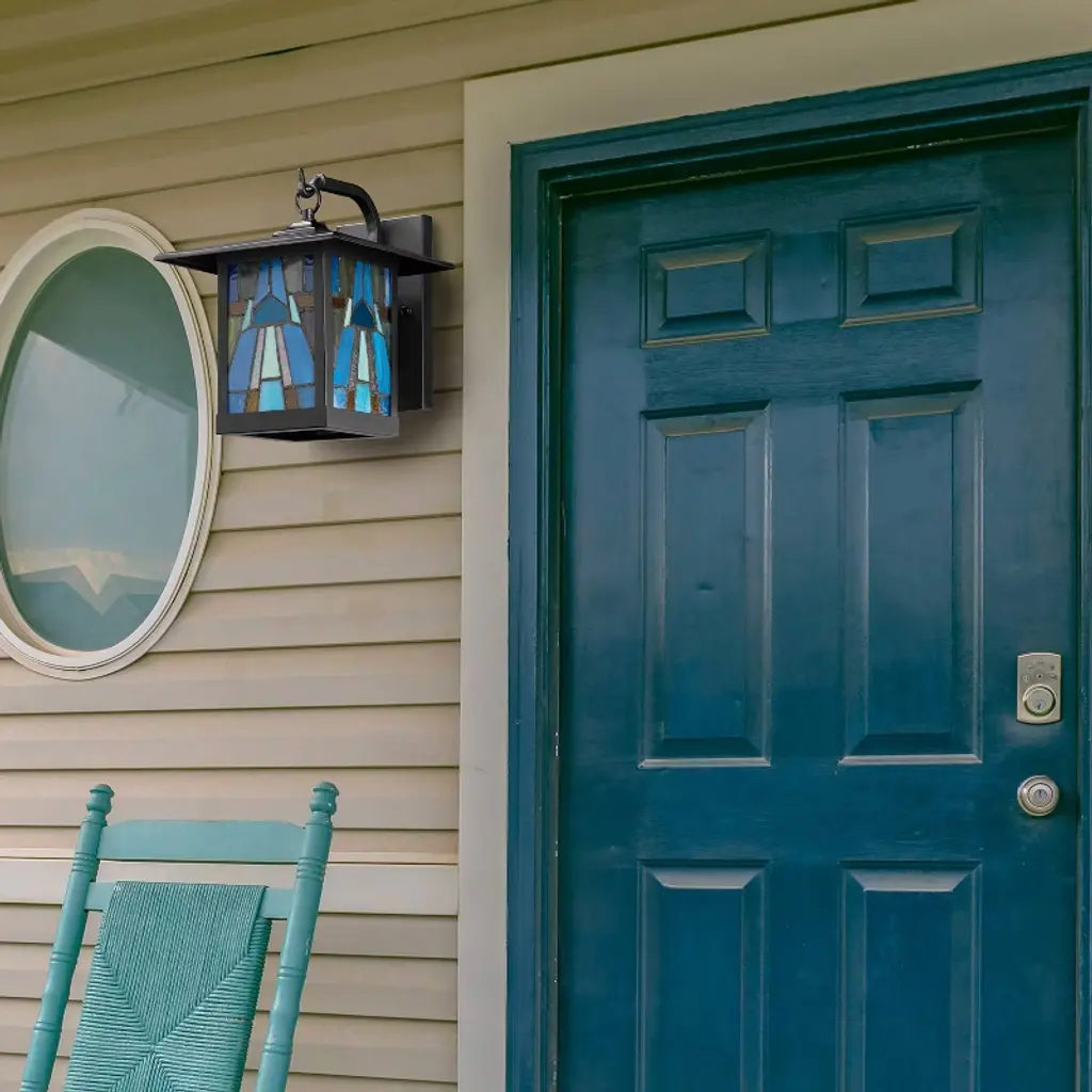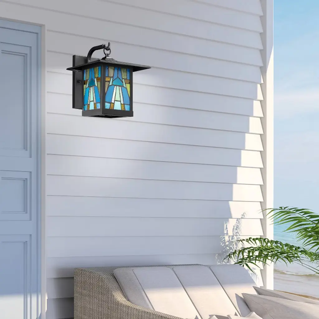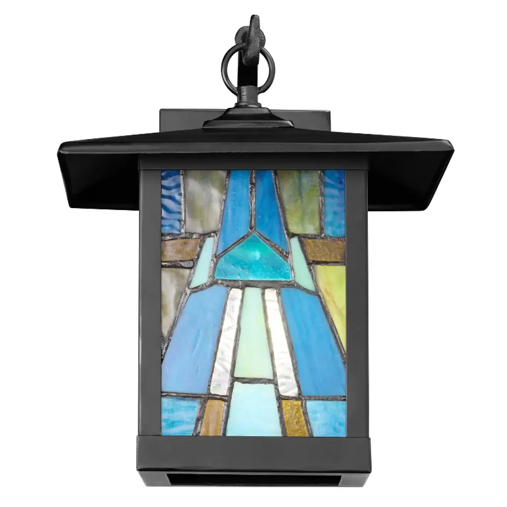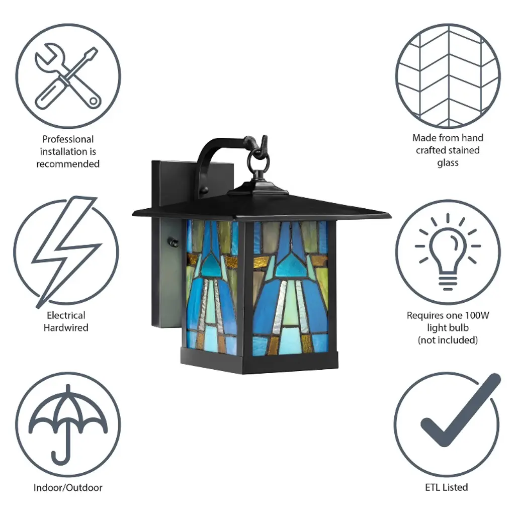 Update your home’s exterior with the charming, warm glow of the 1-Light Aqua Mission Style Outdoor Wall Lantern Sconce Oil-Rubbed Bronze from River of Goods. This light sconce features a traditional lantern design with a bronze look for sleek appeal, while the shade is crafted using cut and stained glass in aqua, amber and brown hues. A geometric pattern creates a charming look you'll love, and the glass is oil rubbed to help prevent scratches. The housing is made from durable metal to lend lasting use and an authentic look you'll appreciate. Whether you mount it near an entryway or your backyard patio, this stained glass lantern is sure to bring elegant charm and extra character to any space.
