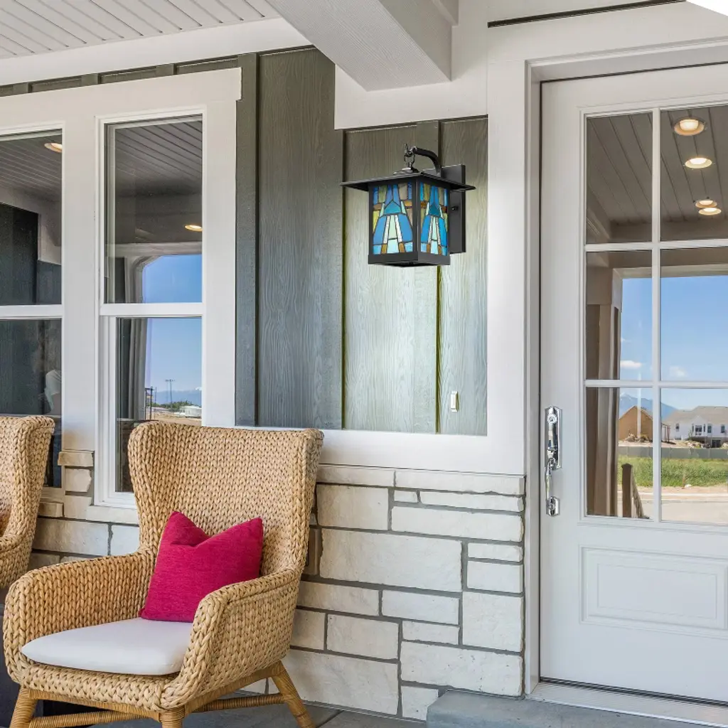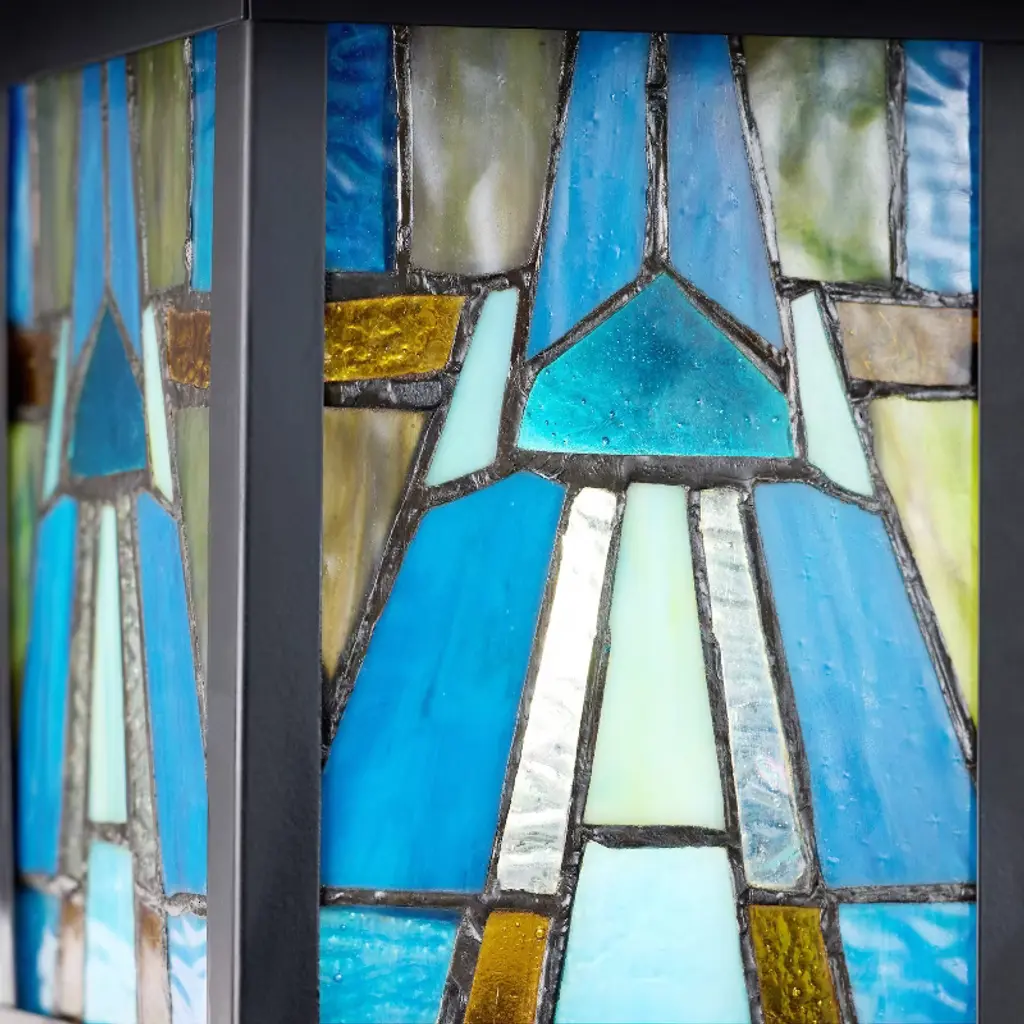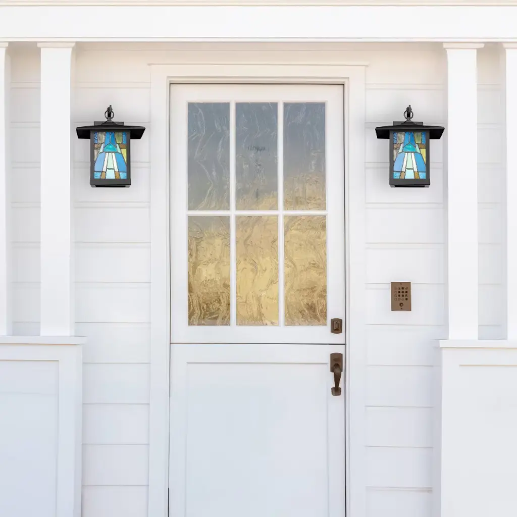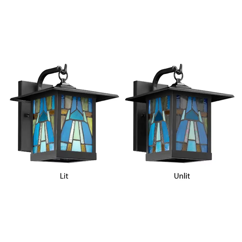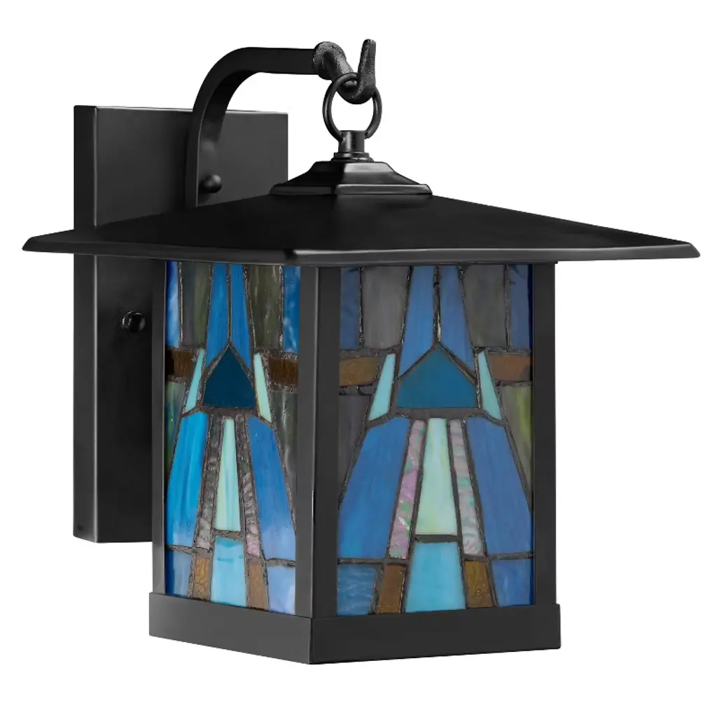 Update your home’s exterior with the charming, warm glow of the 1-Light Aqua Mission Style Outdoor Wall Lantern Sconce Oil-Rubbed Bronze from River of Goods. This light sconce features a traditional lantern design with a bronze look for sleek appeal, while the shade is crafted using cut and stained glass in aqua, amber and brown hues. A geometric pattern creates a charming look you'll love, and the glass is oil rubbed to help prevent scratches. The housing is made from durable metal to lend lasting use and an authentic look you'll appreciate. Whether you mount it near an entryway or your backyard patio, this stained glass lantern is sure to bring elegant charm and extra character to any space.