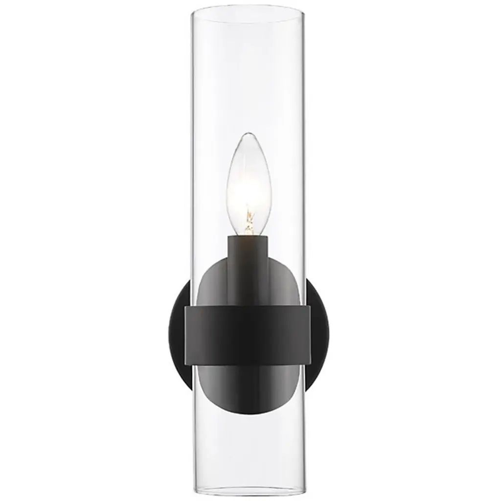 The Rivera Wall Sconce from Alder & Ore introduces a touch of drama with its bold matte black metal frame. Combining contemporary flair with a relaxed sensibility, this sleek design showcases a slender clear glass cylinder shade affixed to a solid steel frame and mount. Whether you place it in a hallway, a bathroom, or a primary living area, this sconce provides ambient lighting with a minimalist yet impactful character. Illuminate your space with style and distinction.