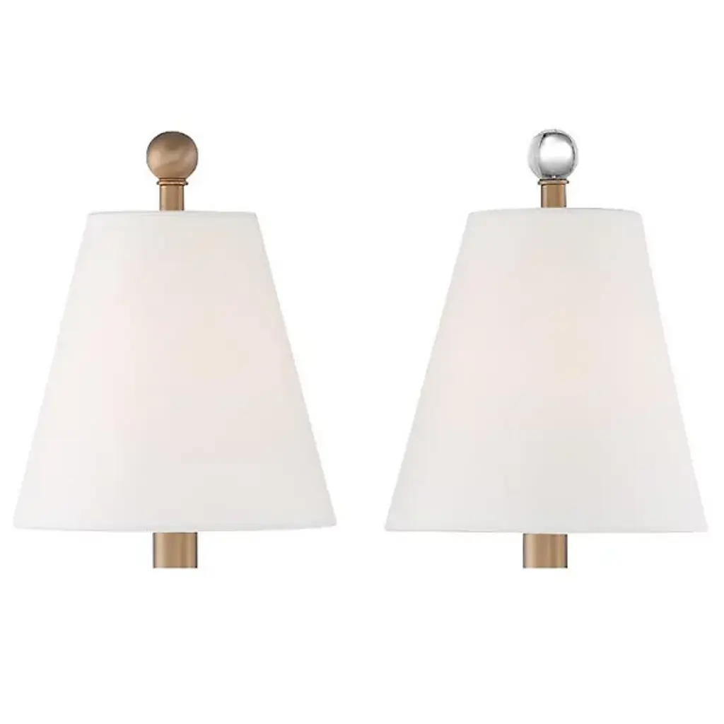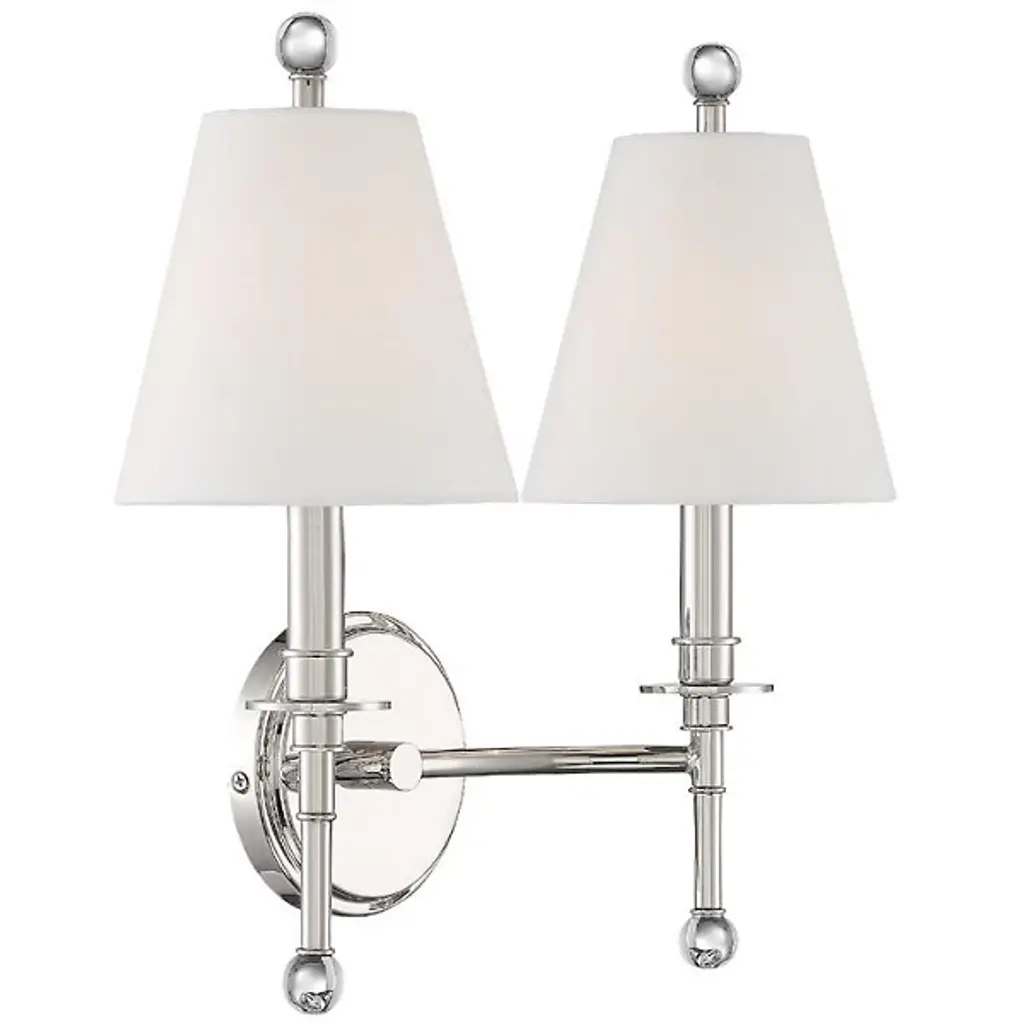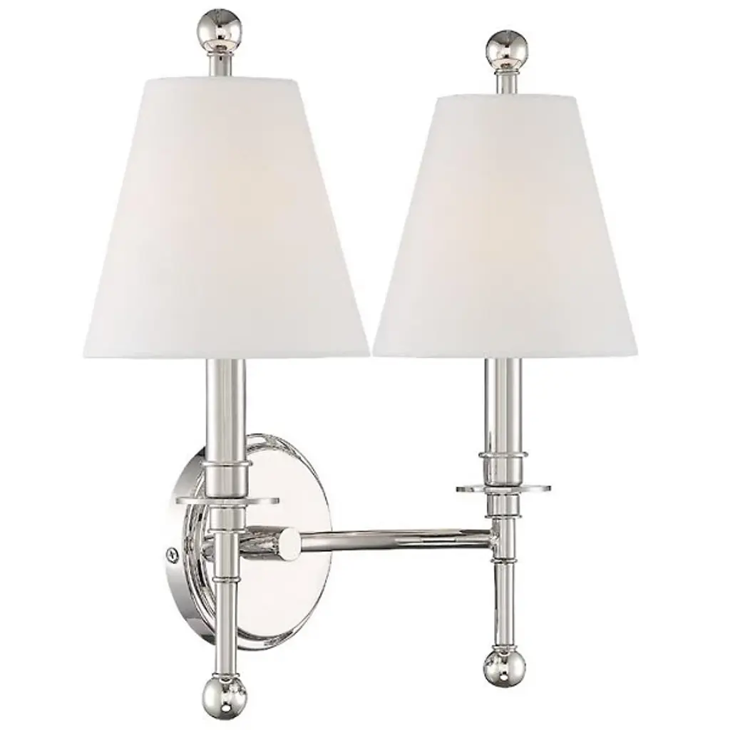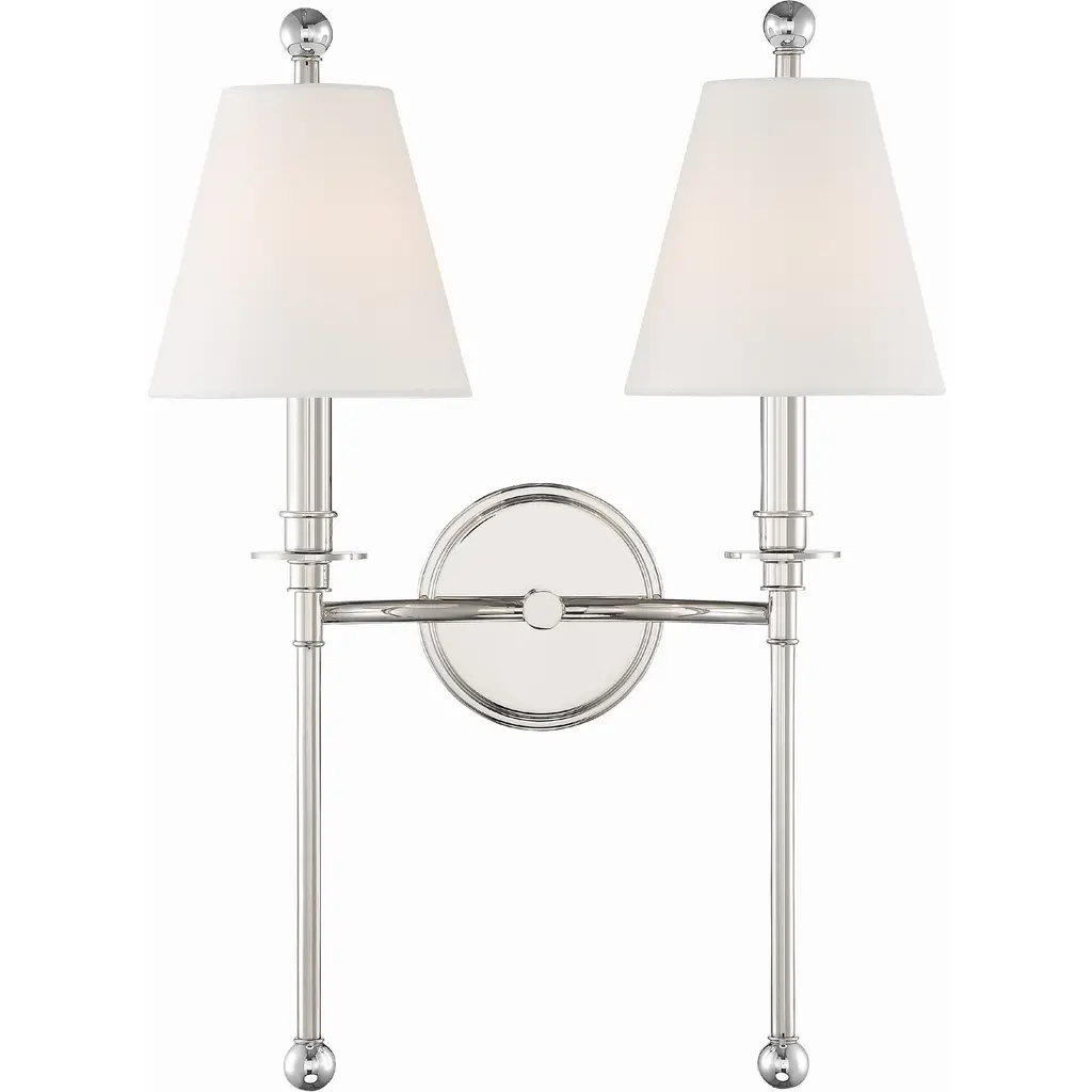 Enliven your wall and hallway spaces with the reassuring classic presence of the Riverdale Wall Sconce from Crystorama. A stepped-disc ceiling mount sends out a single horizontally curving stem, with each end bracing a candelabra-style socket set inside a flared translucent shade that blunts direct brightness into a pleasant ambiance around the fixture. The lamping is embellished by extended steel rods above and below, with their ends capped by translucent, spherical finials that sparkle with reflected light.