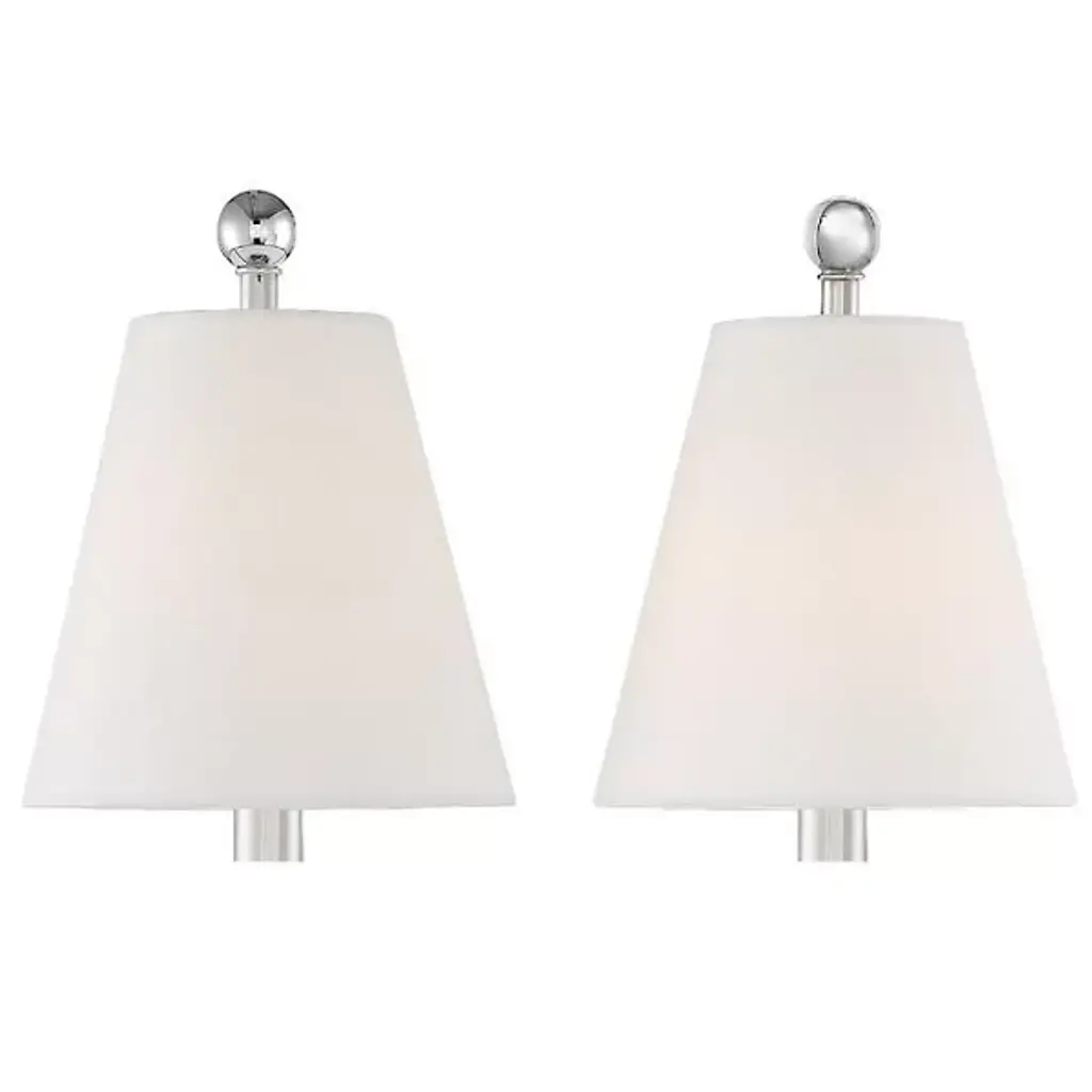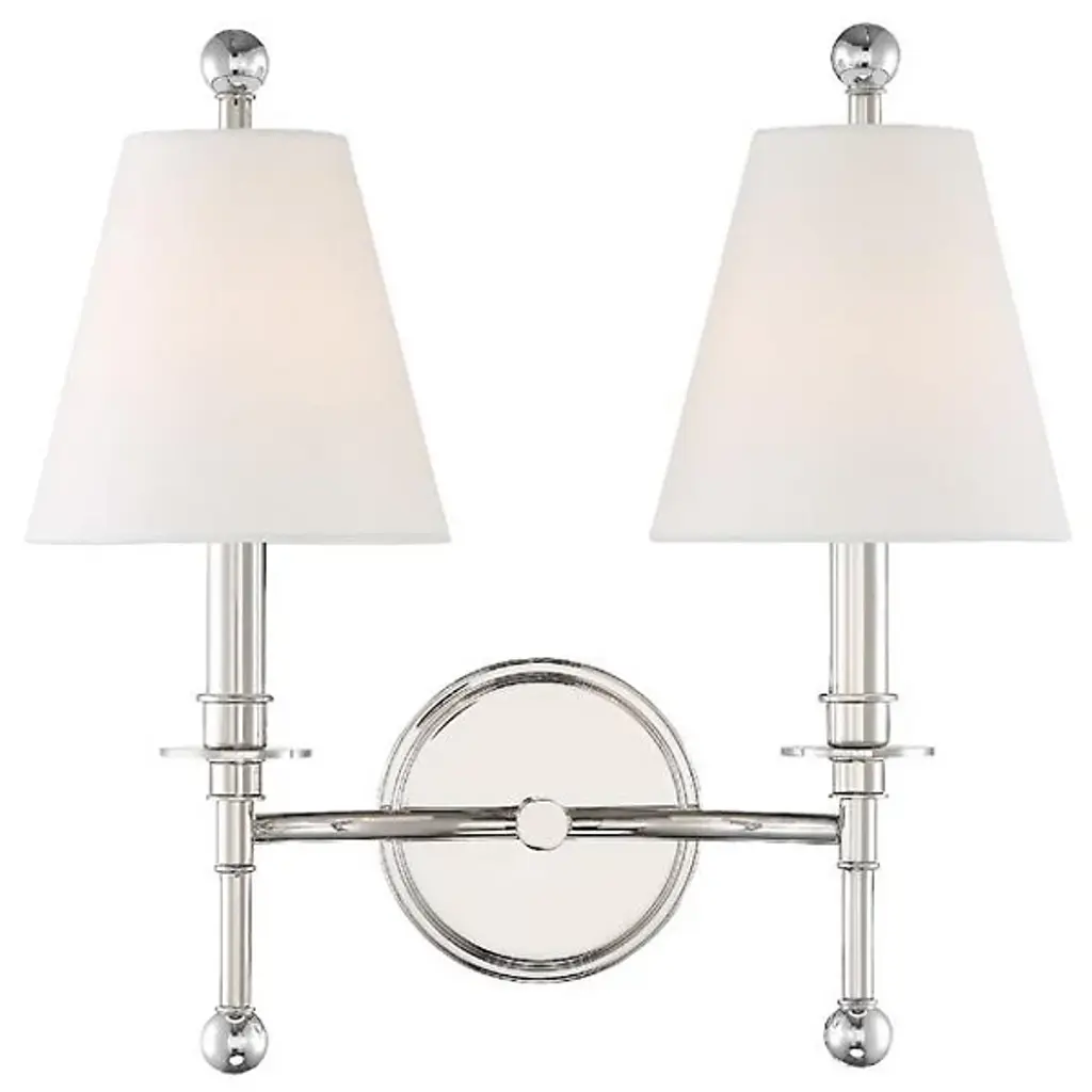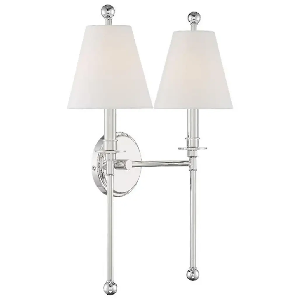 Enliven your wall and hallway spaces with the reassuring classic presence of the Riverdale Wall Sconce from Crystorama. A stepped-disc ceiling mount sends out a single horizontally curving stem, with each end bracing a candelabra-style socket set inside a flared translucent shade that blunts direct brightness into a pleasant ambiance around the fixture. The lamping is embellished by extended steel rods above and below, with their ends capped by translucent, spherical finials that sparkle with reflected light.