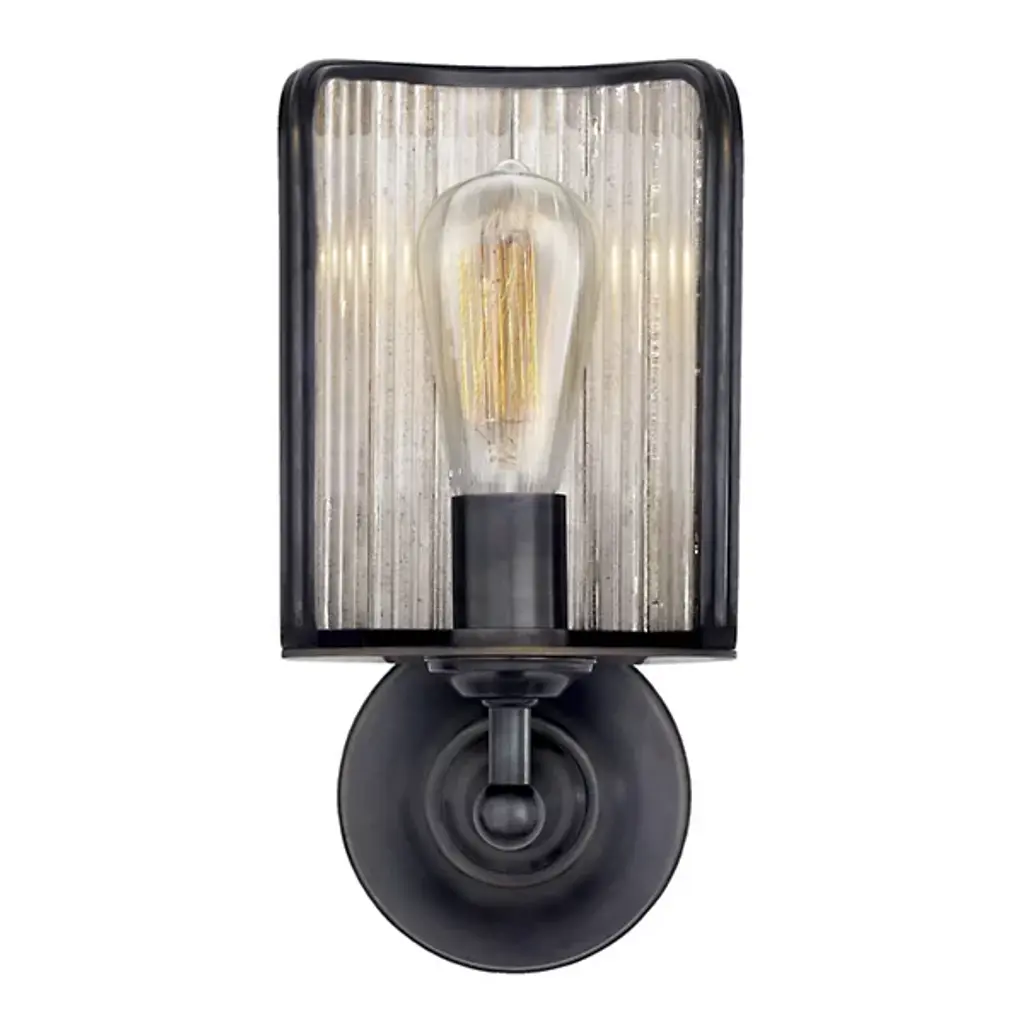 Snazzy functionality in a transitional design by Ralph Lauren. The Visual Comfort Signature, formerly known as Visual Comfort, Rivington Wall Sconce creates a dazzling runaway for its light. A steel shade presents an open platform for a bare-bulb design. Antique ribbed mirrors accentuate the figure of the bulb in a stylish background. When turned on, an ambient glow scattering across the reflective inner mirror walls beams back into the room with an elegant texture. A droplet-shaped backplate anchors the structure neatly to your walls with a space-efficient design.