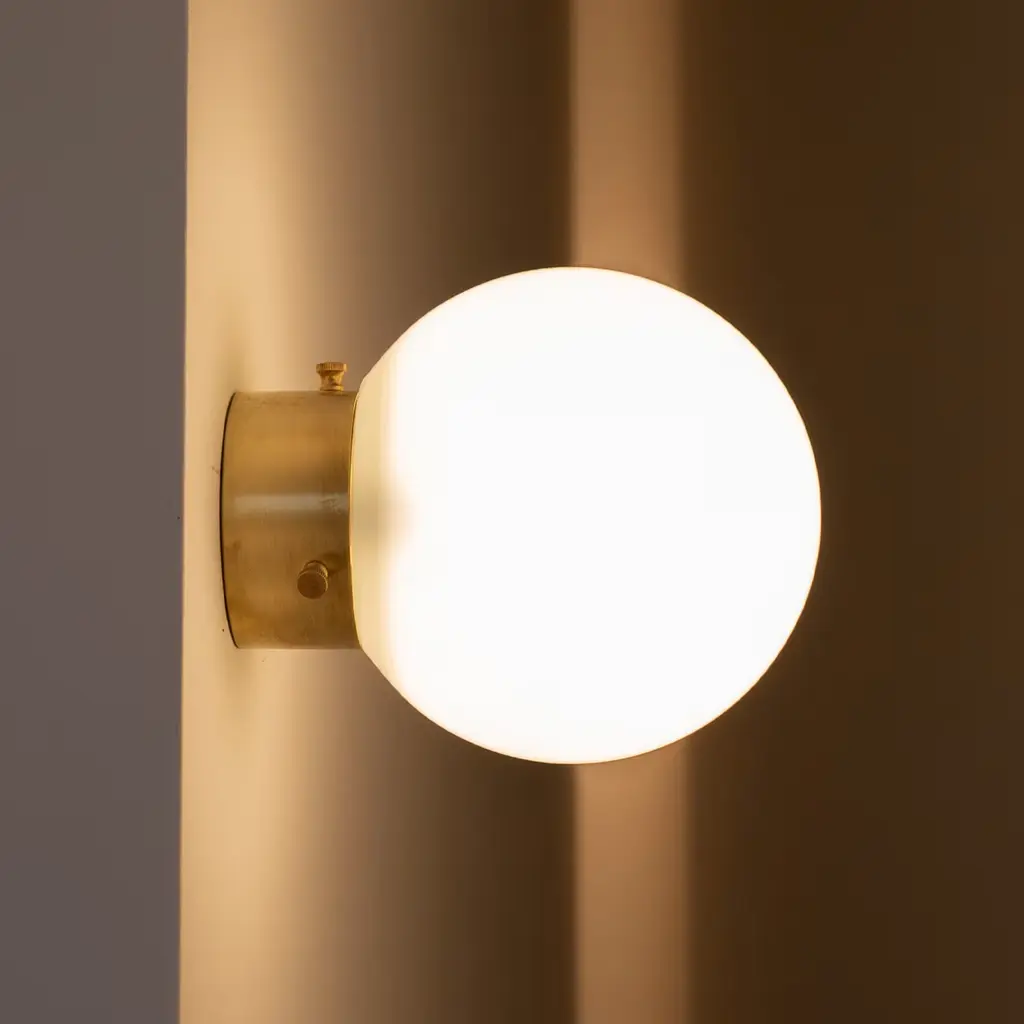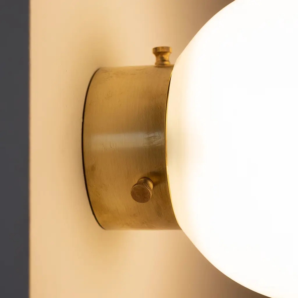 A wall lamp featuring a round milky glass diffuser paired with a cylindrical base finished in gold brass. This applique combines soft, diffused light with a sleek, minimal silhouette, suitable for a variety of interior settings. The model is offered in multiple finishes as detailed in the related finishes file, making it adaptable to different design schemes. Perfect for adding understated elegance and warm illumination to walls. Also available in a range of finishes to suit diverse design preferences. Please contact the Concierge for more information.