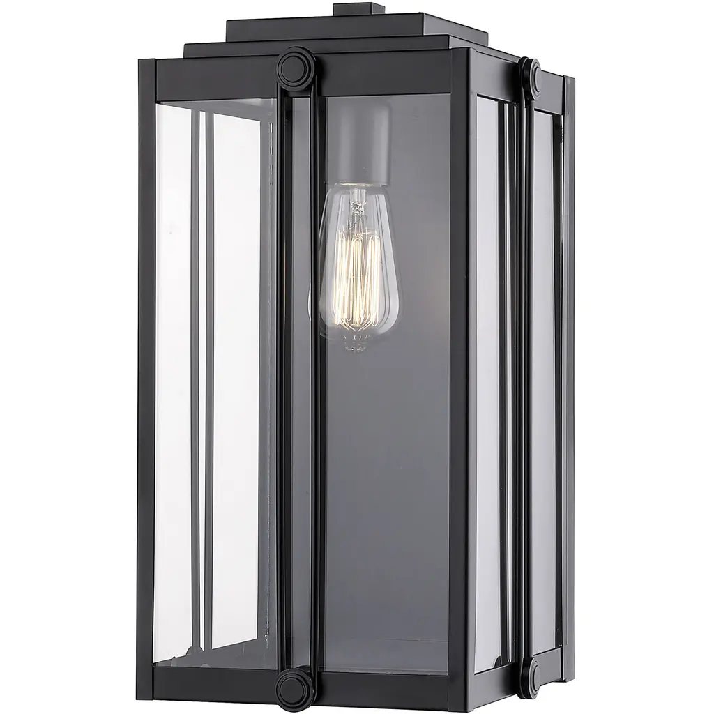 Robbins outdoor lanterns combine a classic silhouette with industrial style details. Gold decorative accents add a hint of luster to the matte black frame, while clear seedy glass panels maximize illumination and intrigue. Robbins is available as a post lantern or in multiple sizes of wall light, perfect for illuminating a front porch or landscape.