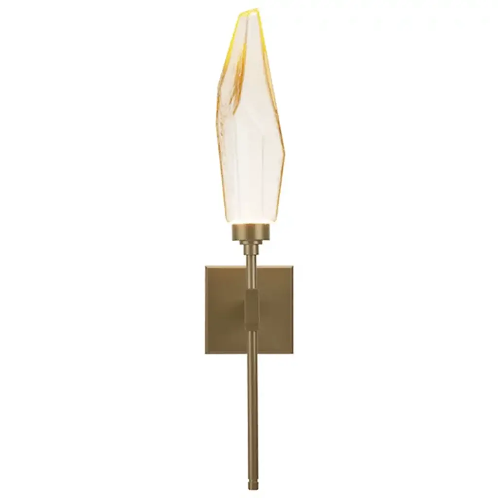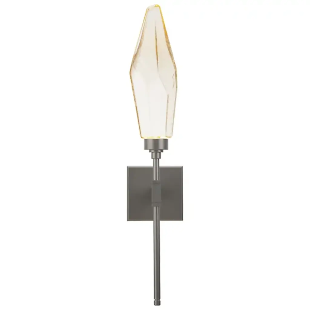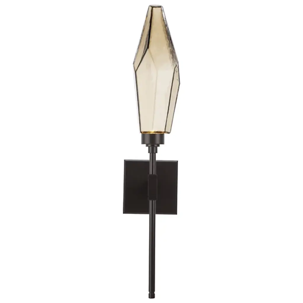 Illuminate your home with the natural beauty of the Rock Crystal LED Belvedere Wall Sconce by Hammerton Studio. Its organic shape is formed from artisan blown glass, creating a raw crystal shade that sits atop a slender metal stem. Supported by a square backplate, the fixture presents a refined and modern structure that suits a wide range of modern décor styles. An integrated LED light source at the crystal’s base emits a soft beam of light, creating a serene glow.