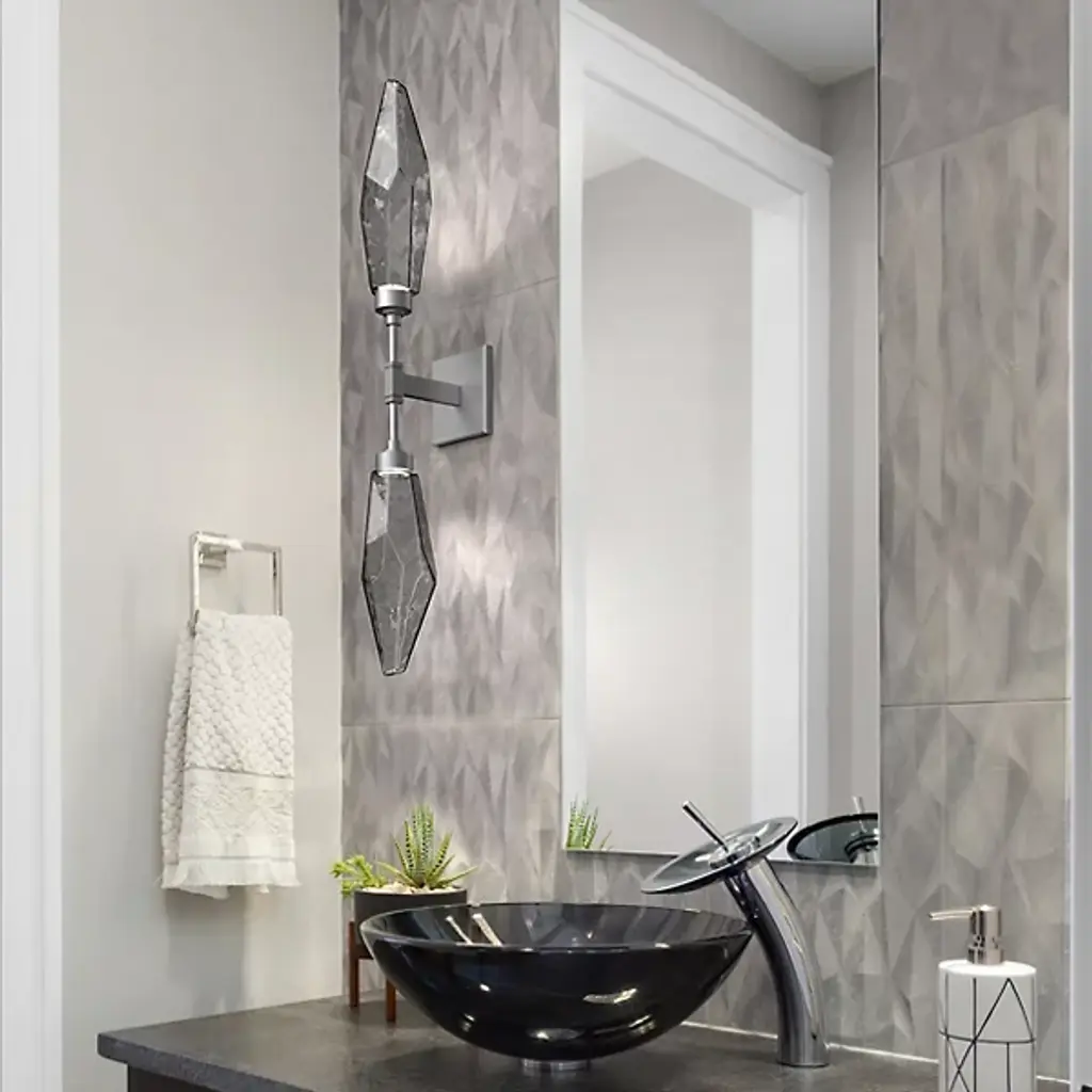 The Rock Crystal LED Double Wall Sconce from Hammerton Studio stands out with a memorable and simple structure accentuated by angular accents. A square wall plate keeps the fixture in place, while a central bar heads outward, holding a short vertical rod that extends LED lamping above and below. This lamping casts a bright flare of light gentled by an angular prism shade of artisan glass shade that extends over each end, bathing its surroundings in a glittering glow.