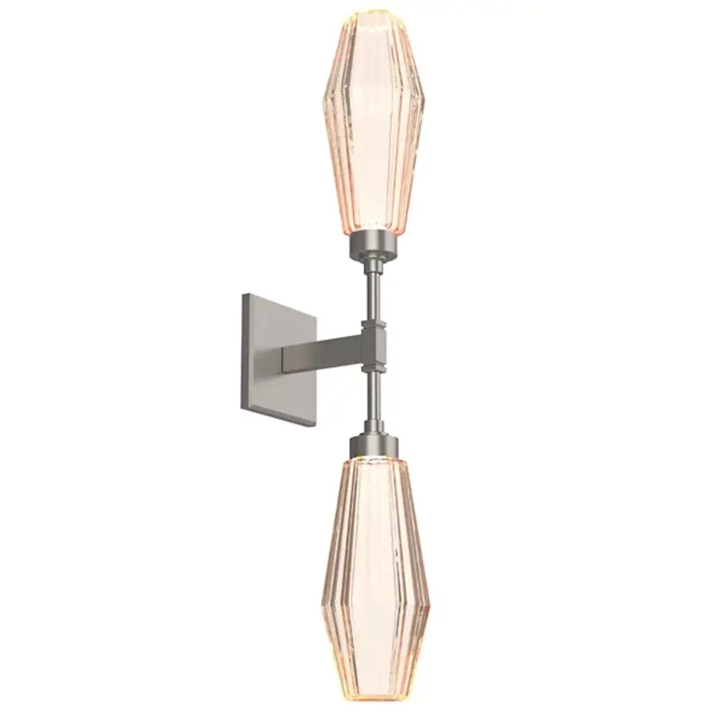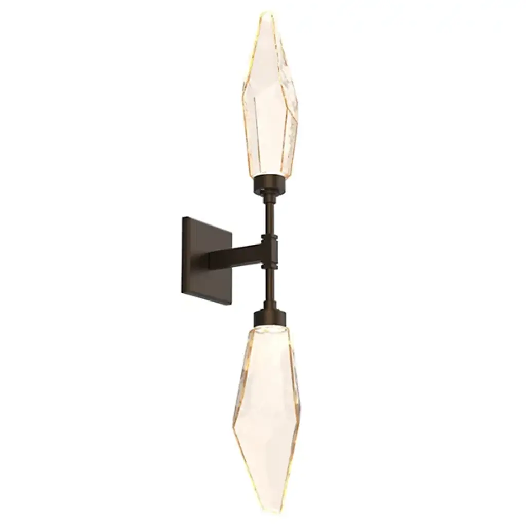 The Rock Crystal LED Double Wall Sconce from Hammerton Studio stands out with a memorable and simple structure accentuated by angular accents. A square wall plate keeps the fixture in place, while a central bar heads outward, holding a short vertical rod that extends LED lamping above and below. This lamping casts a bright flare of light gentled by an angular prism shade of artisan glass shade that extends over each end, bathing its surroundings in a glittering glow.