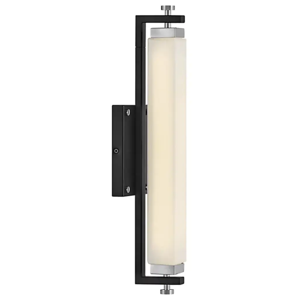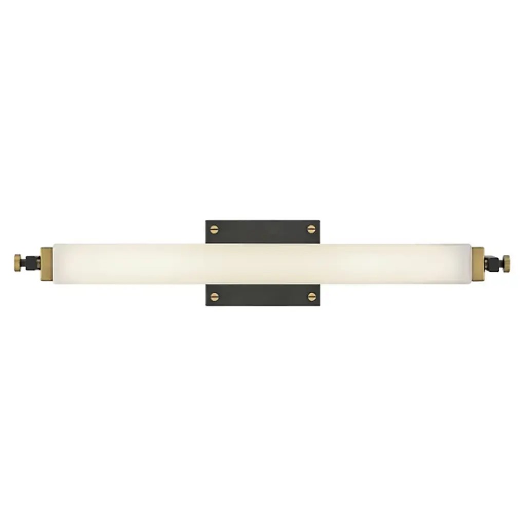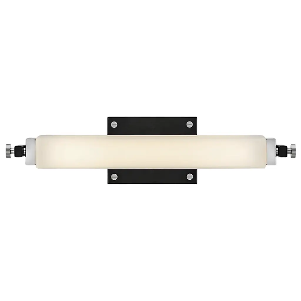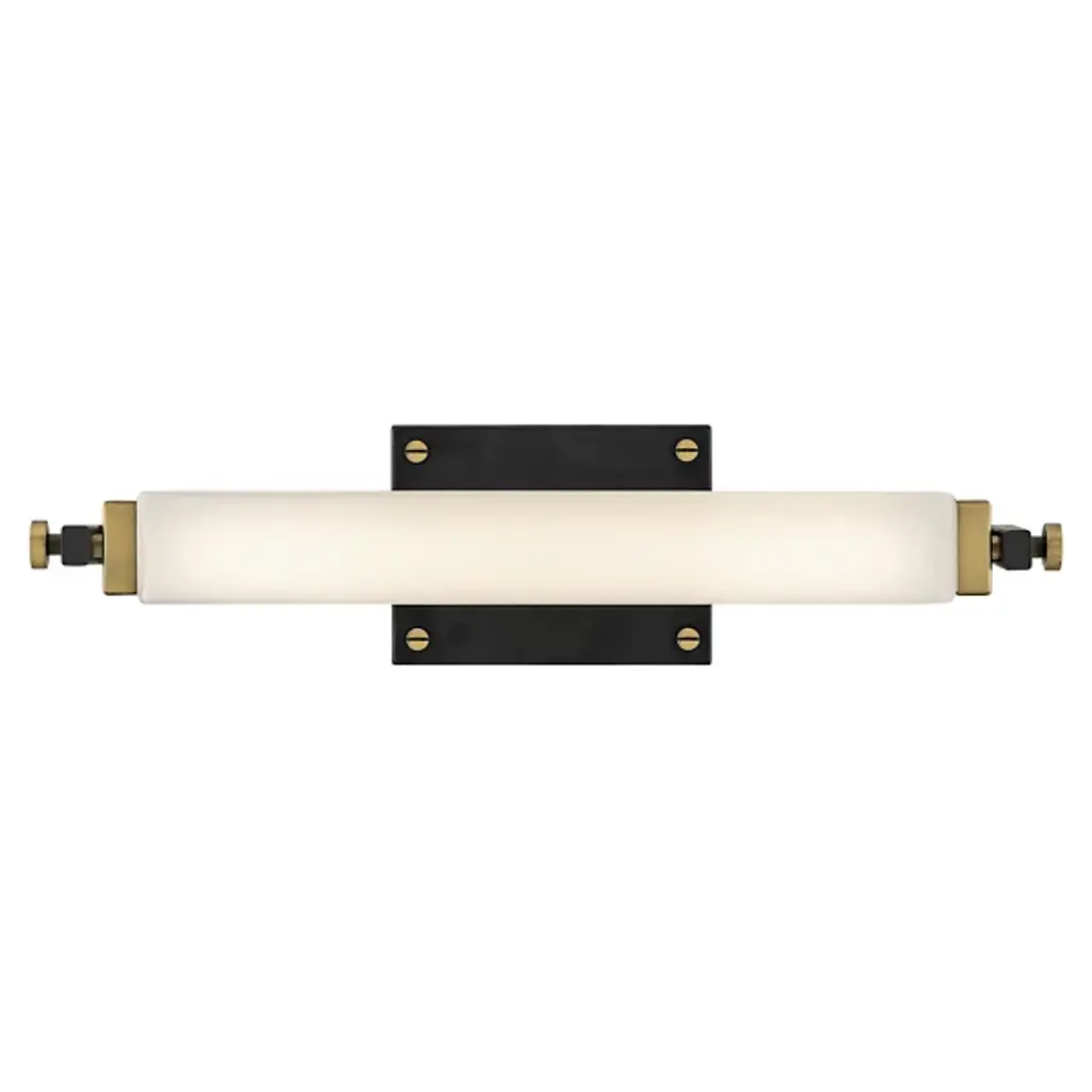 Add bold brightness to your bathroom spaces with the layered, appealing construction of the Rollins LED Bathbar from Hinkley Lighting. Capable of mounting vertically on either side of a bathroom mirror or held horizontally over it, a rectangular wall plate with a bolt at each corner provides solid support for a flat-sided central bracket. A metal knob protrudes from each end to enclose damp-listed and ADA-compliant LED lamping inside a rectangular prism of etched opal glass capped by metal accents. The contrasting textures and shapes offer a touch of industrial intrigue, while the translucent shade exchanges a bright glare for a warm glow in all directions.