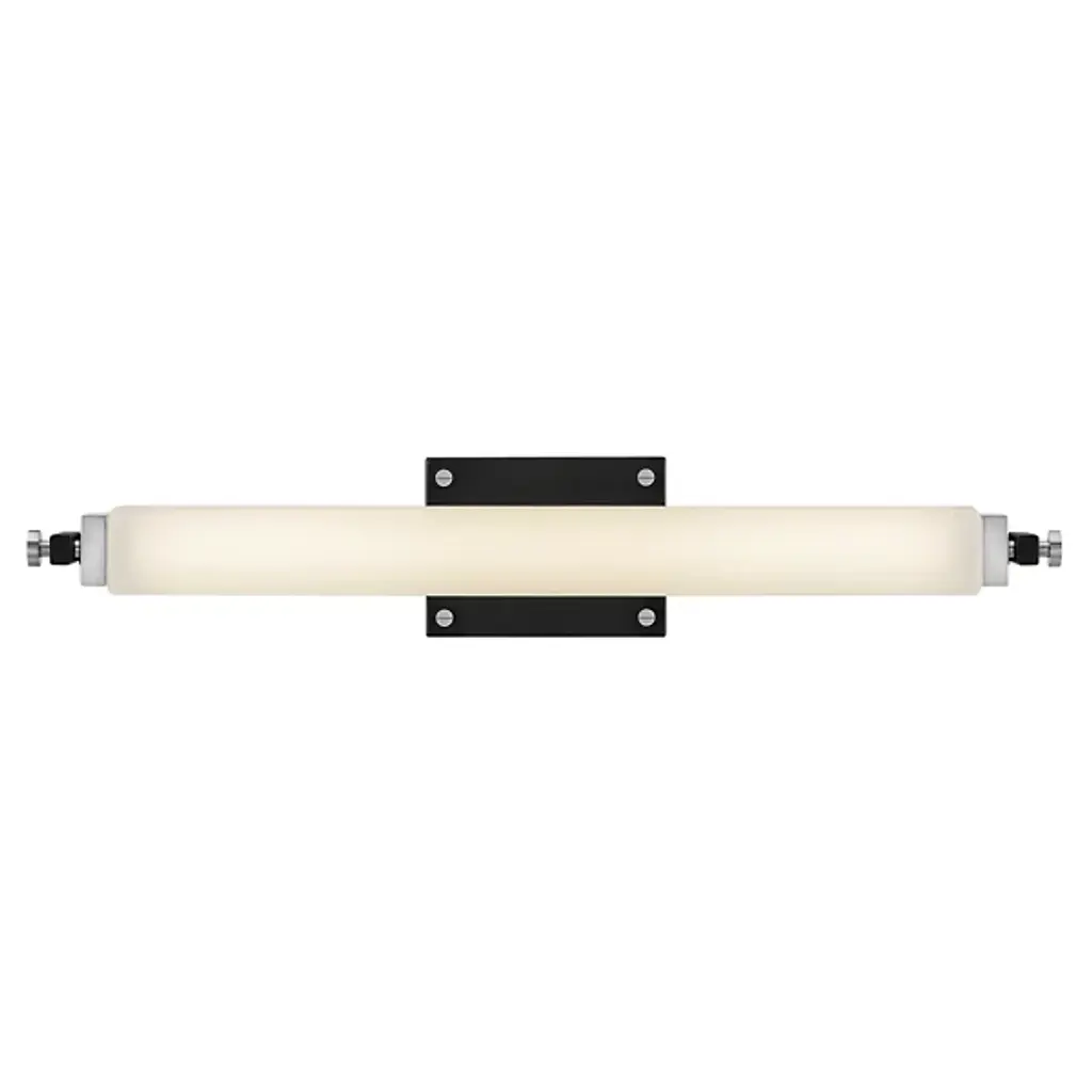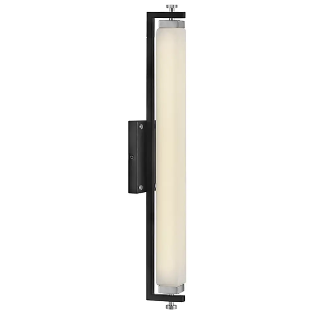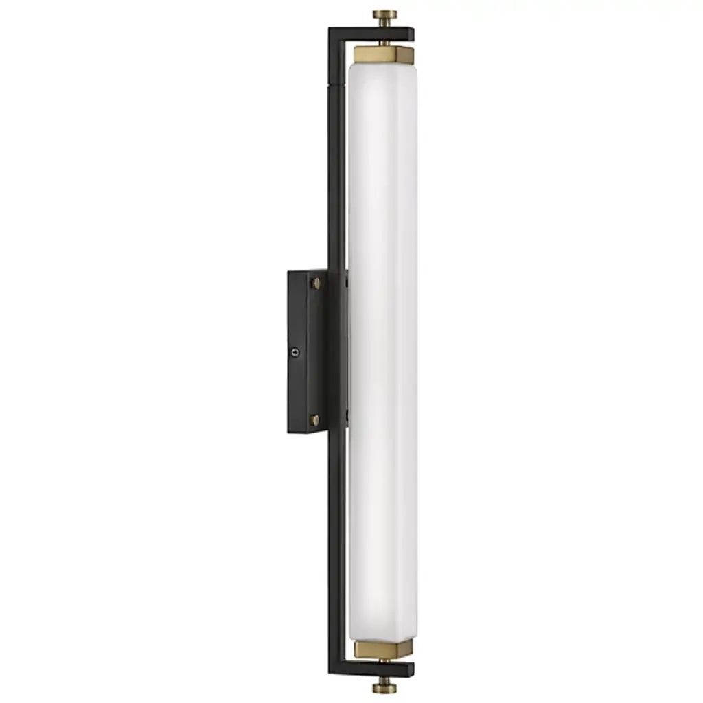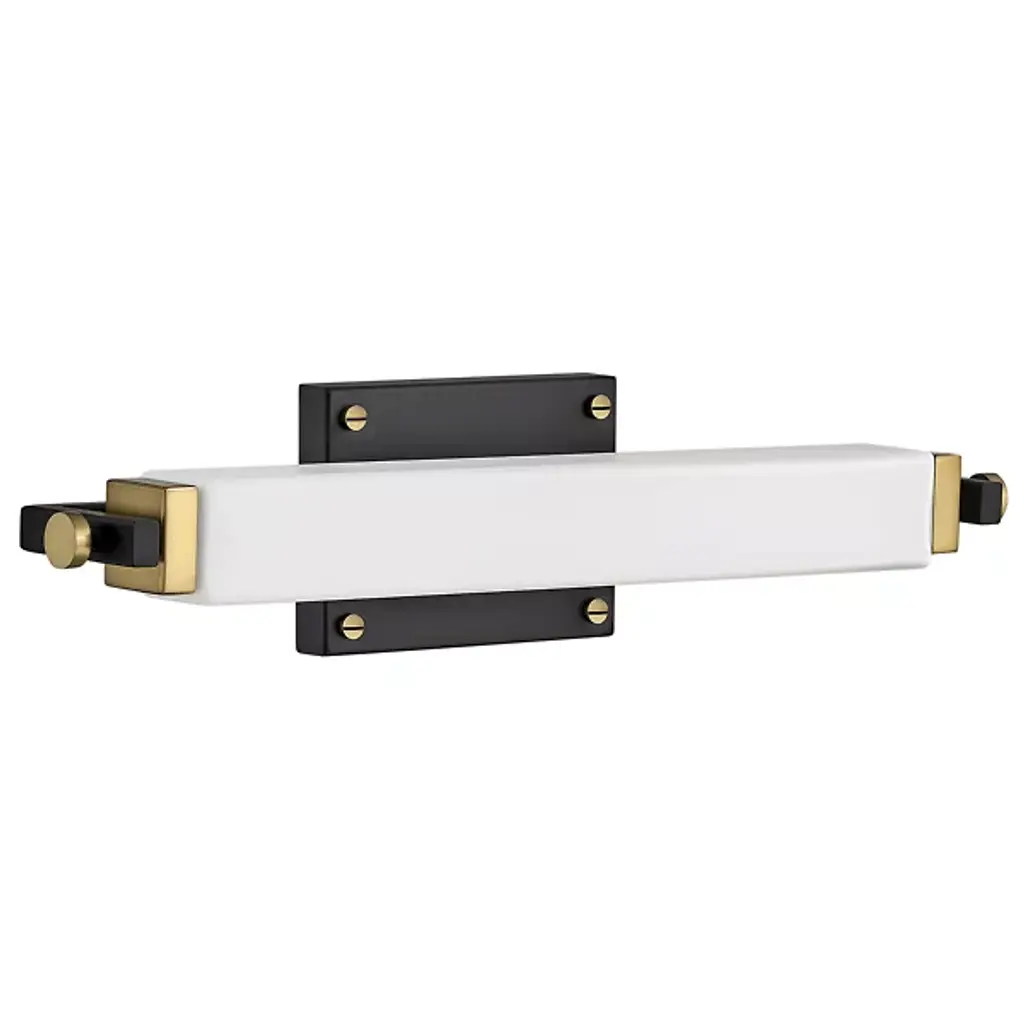 Add bold brightness to your bathroom spaces with the layered, appealing construction of the Rollins LED Bathbar from Hinkley Lighting. Capable of mounting vertically on either side of a bathroom mirror or held horizontally over it, a rectangular wall plate with a bolt at each corner provides solid support for a flat-sided central bracket. A metal knob protrudes from each end to enclose damp-listed and ADA-compliant LED lamping inside a rectangular prism of etched opal glass capped by metal accents. The contrasting textures and shapes offer a touch of industrial intrigue, while the translucent shade exchanges a bright glare for a warm glow in all directions.