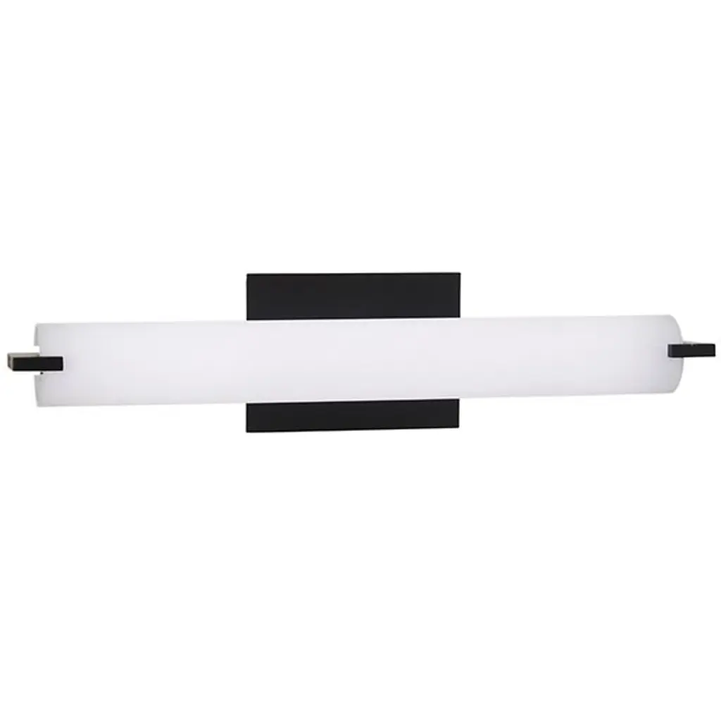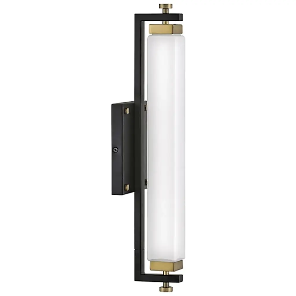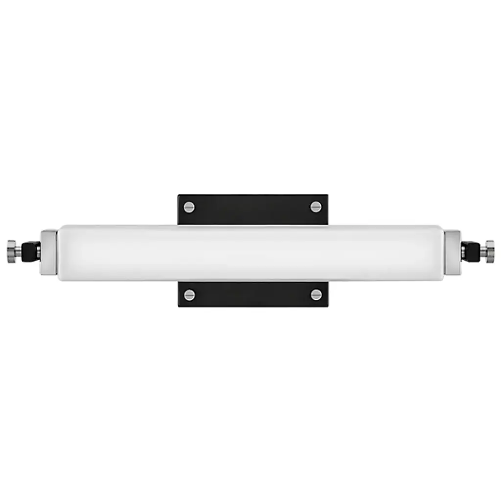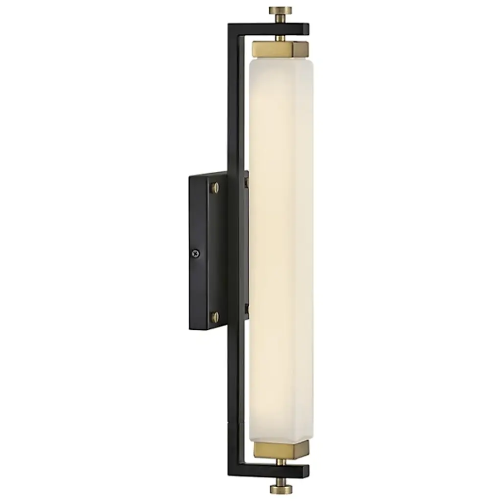 Add bold brightness to your bathroom spaces with the layered, appealing construction of the Rollins LED Bathbar from Hinkley Lighting. Capable of mounting vertically on either side of a bathroom mirror or held horizontally over it, a rectangular wall plate with a bolt at each corner provides solid support for a flat-sided central bracket. A metal knob protrudes from each end to enclose damp-listed and ADA-compliant LED lamping inside a rectangular prism of etched opal glass capped by metal accents. The contrasting textures and shapes offer a touch of industrial intrigue, while the translucent shade exchanges a bright glare for a warm glow in all directions.