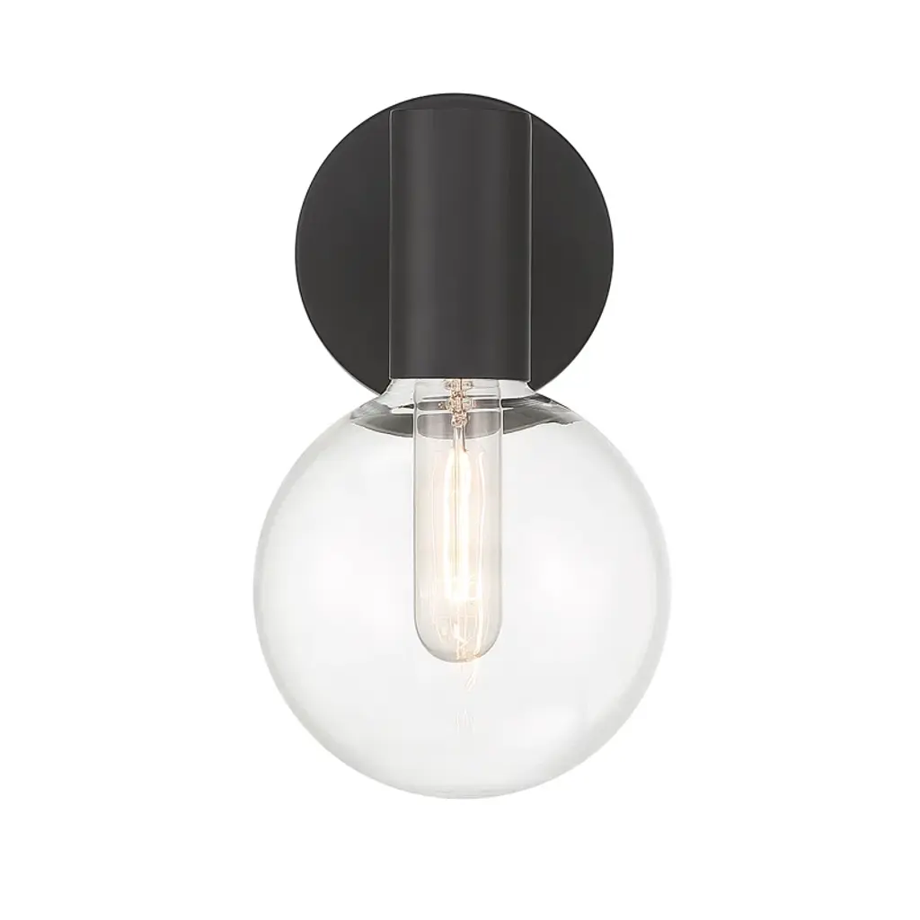 Great choice for a minimalist yet stylish lighting option! The globe clear glass shade of this 1-light sconce adds a touch of modernity to any space, while the multiple finish options make it easy to complement any decor style. It's also practical, providing an extra layer of protection for the bulb inside. At 10" in height and 5.75" in width, it's compact yet impactful, extending 7.5" from the wall. The sconce uses 1 standard size bulb with a max of 60 watts (bulb not included), and a tubular shaped bulb is recommended for the best aesthetic effect.