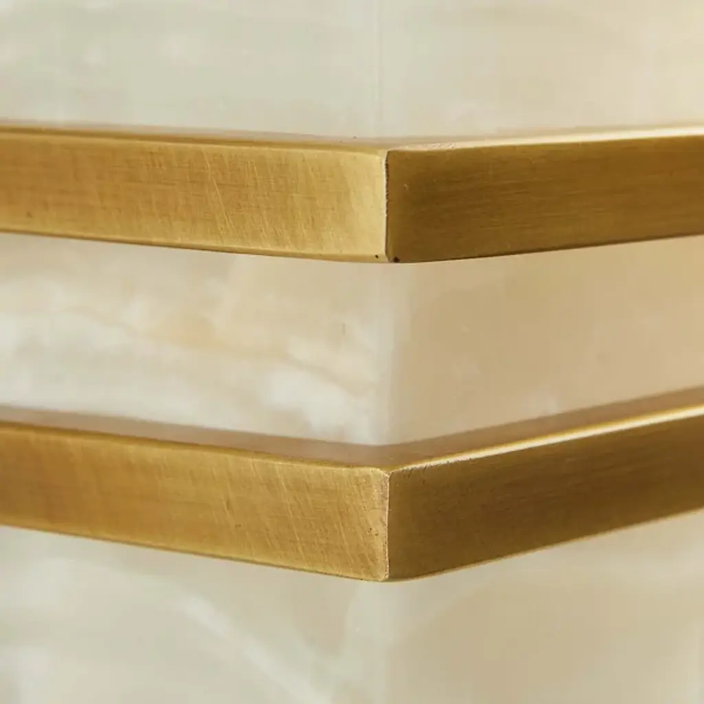 The Ronan Wall Sconce from Arteriors is a crisp, compact flashback to antique luminaires. It recalls the graphic designs of the 20s and 30s. Hidden mounting hardware raises the sconce’s intrigue with a floating look. A pair of angular metal accents wrap over the front, delivering a punch of bold color. The onyx shade inside displays a mesmerizing texture that evokes a beautiful painting. This artful and natural shade emanates an ambient warmth suited for across the home.