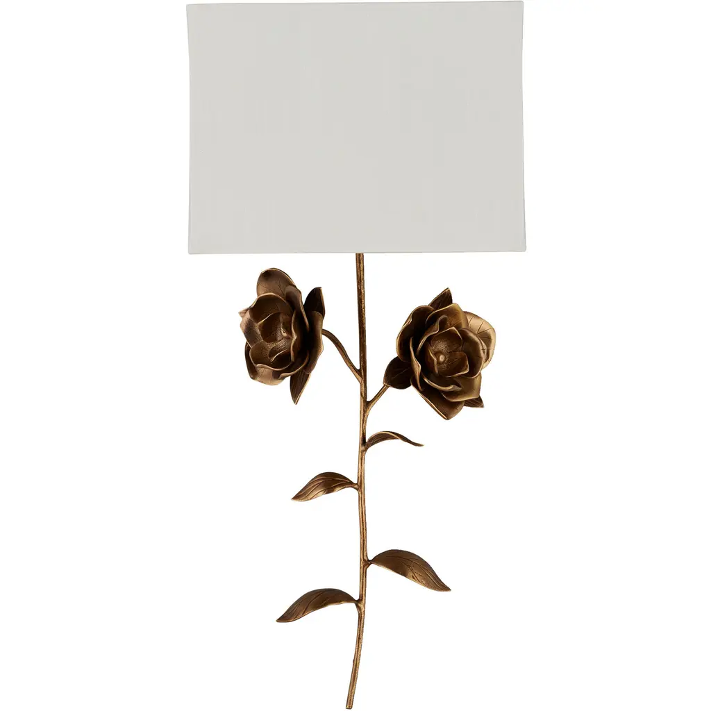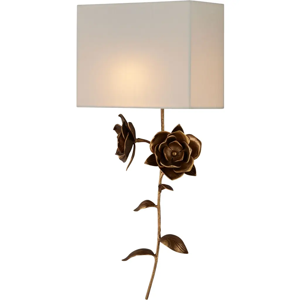 The Rosabel Wall Sconce is a bouquet of delight designed by Tom Caldwell. By placing the blooms along the undulant stem and designing the leaves to float downward, he created a whimsical gold wall sconce that is nature-inspired but seriously sophisticated. The roses and leaves are fashioned from brass in an antique brass finish. The off-white shantung shade was designed to be narrow so this fixture is ADA compliant.