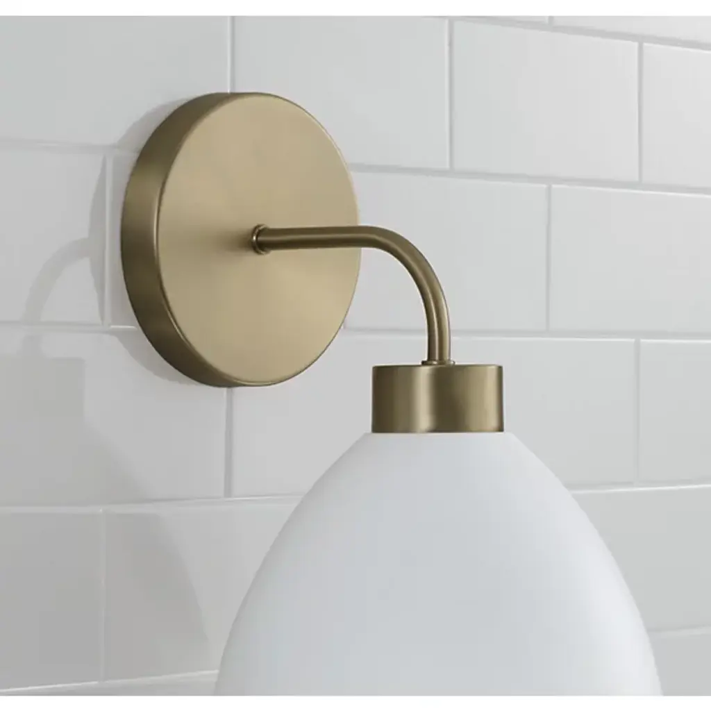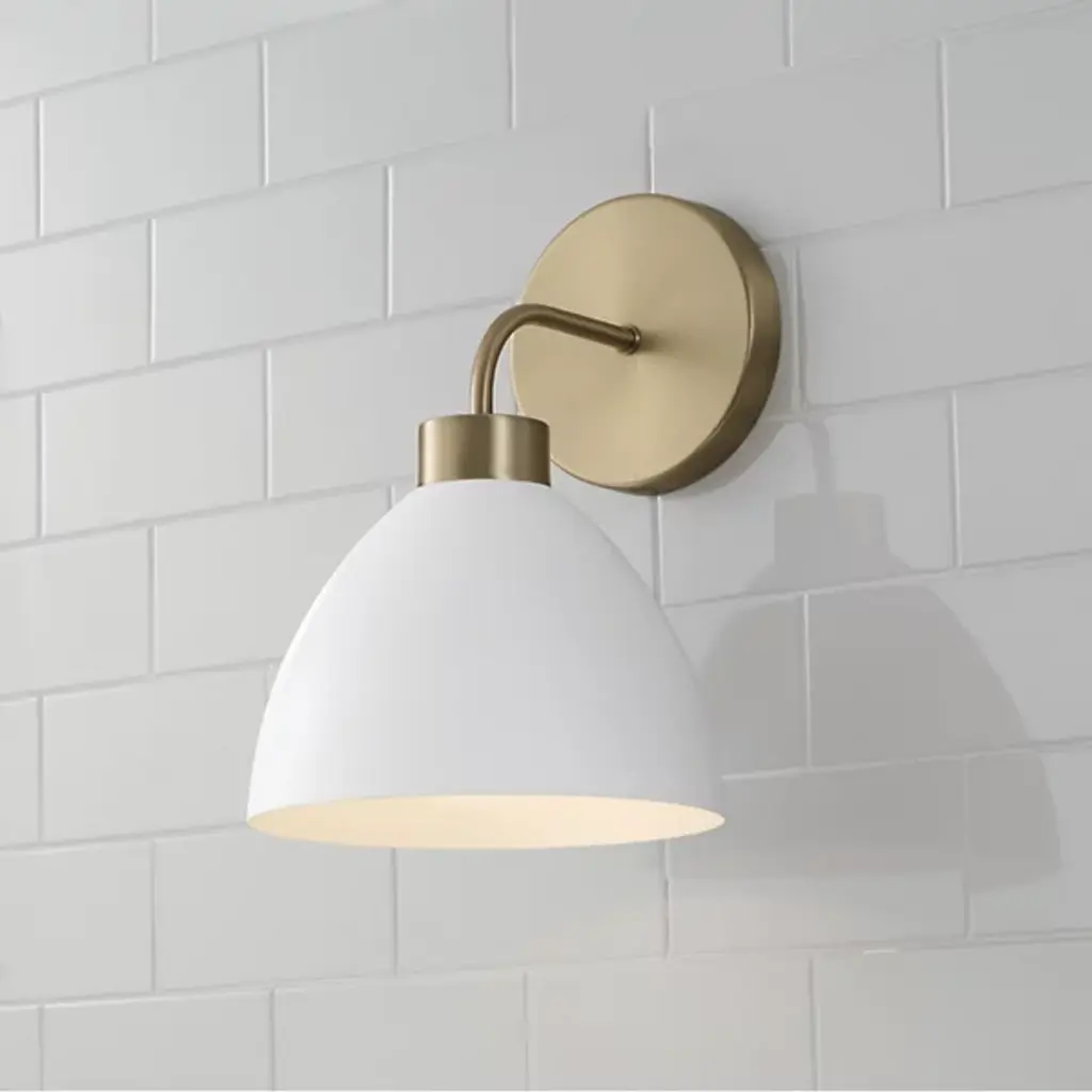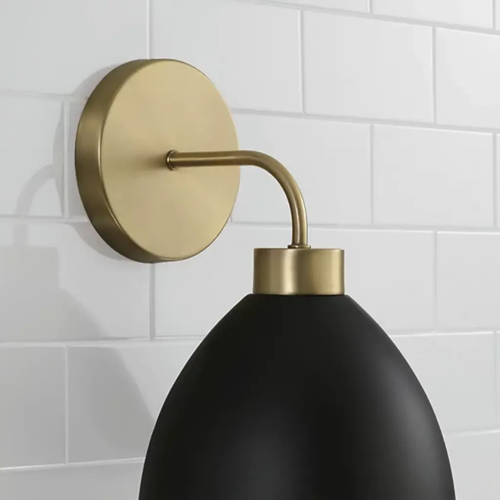 Illuminate your space with the charming style of the Ross Wall Sconce from Capital Lighting. The curved black metal shade, featuring a white interior, crafts a retro-inspired silhouette that evokes a sense of nostalgia. aged brass details add a touch of mid-century flair, blending seamlessly with modern aesthetics. Elevate your interior with this distinctive sconce, where classic design meets contemporary sophistication, casting warm and stylish light in any room.