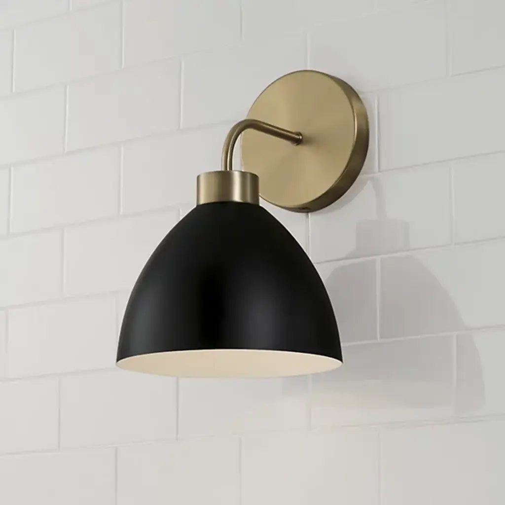Illuminate your space with the charming style of the Ross Wall Sconce from Capital Lighting. The curved black metal shade, featuring a white interior, crafts a retro-inspired silhouette that evokes a sense of nostalgia. aged brass details add a touch of mid-century flair, blending seamlessly with modern aesthetics. Elevate your interior with this distinctive sconce, where classic design meets contemporary sophistication, casting warm and stylish light in any room.