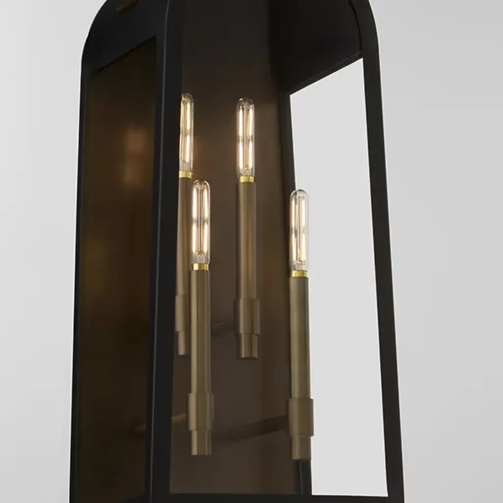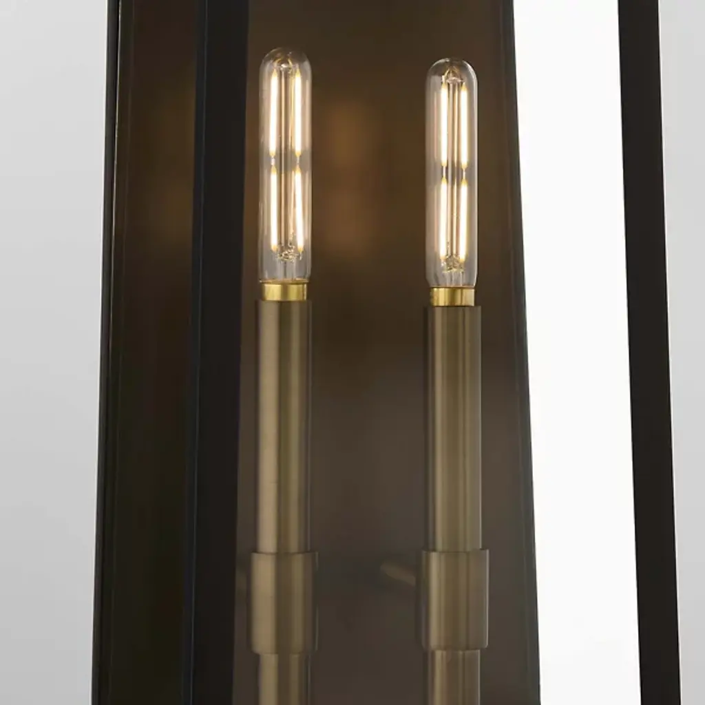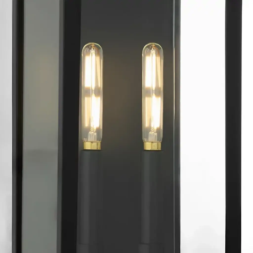 The Rossi Outdoor Wall Sconce from Quorum International brings lantern-inspired charm to outdoor spaces. Clear glass panels showcase staggered bulbs mounted on tubular stands, creating depth within the rectangular frame. The curved handle detail adds a traditional touch to the modern interpretation. This wet-listed fixture brightens entryways, patios, and garden paths while maintaining its pristine appearance in outdoor conditions. Its dimmable functionality lets you customize the lighting to suit your space.