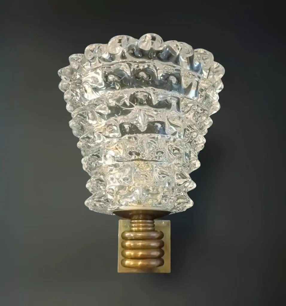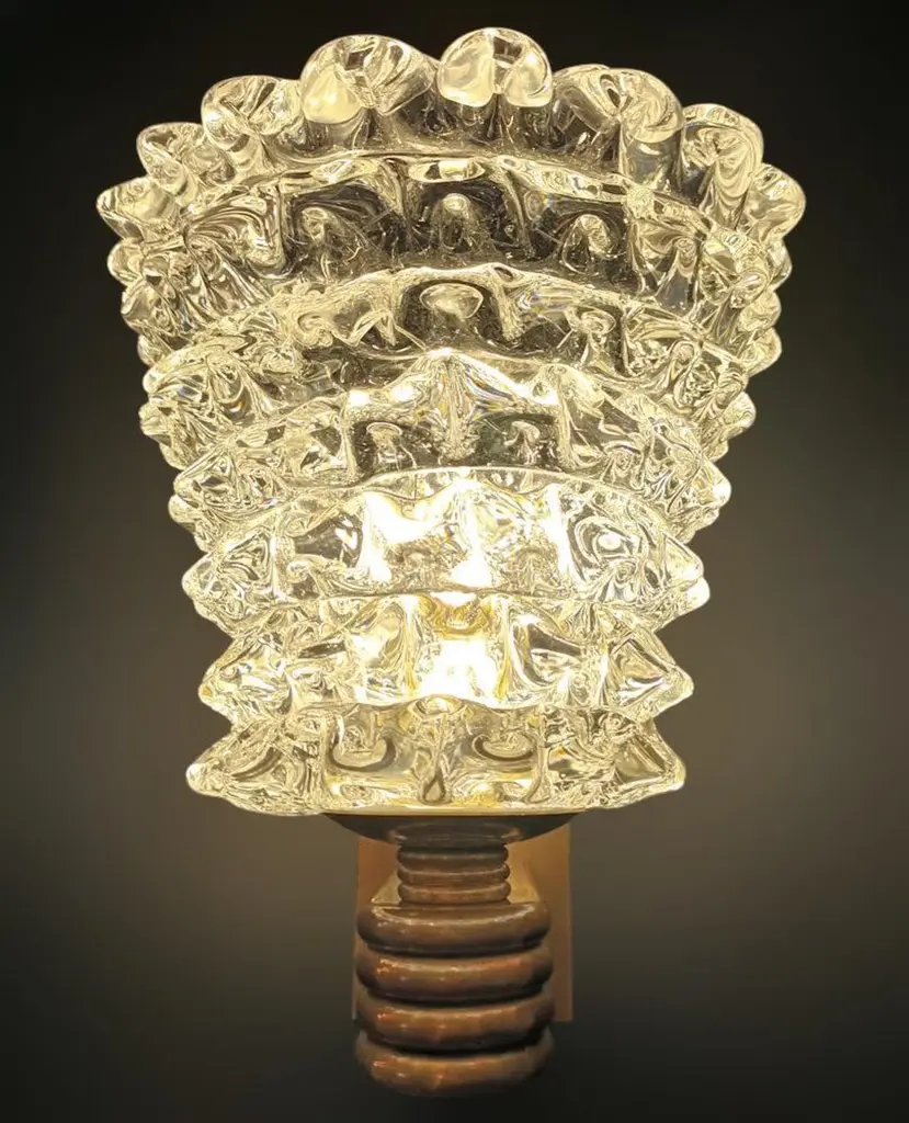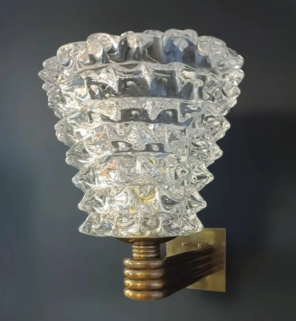 Original vintage Italian wall lights with clear Murano glass hand blown to create a beaked textured effect using Rostrato technique, mounted on brass bracket / Designed by Barovier e Toso, circa 1960s with original Barovier e Toso maker's mark on the frame / Made in Italy1 light / E26 or E27 type / max 60WMeasures: Height 12 inches, width 10 inches, depth 12 inches18 available in stock in Italy, price listed is for each itemOrder reference #: FABIOLTD K47