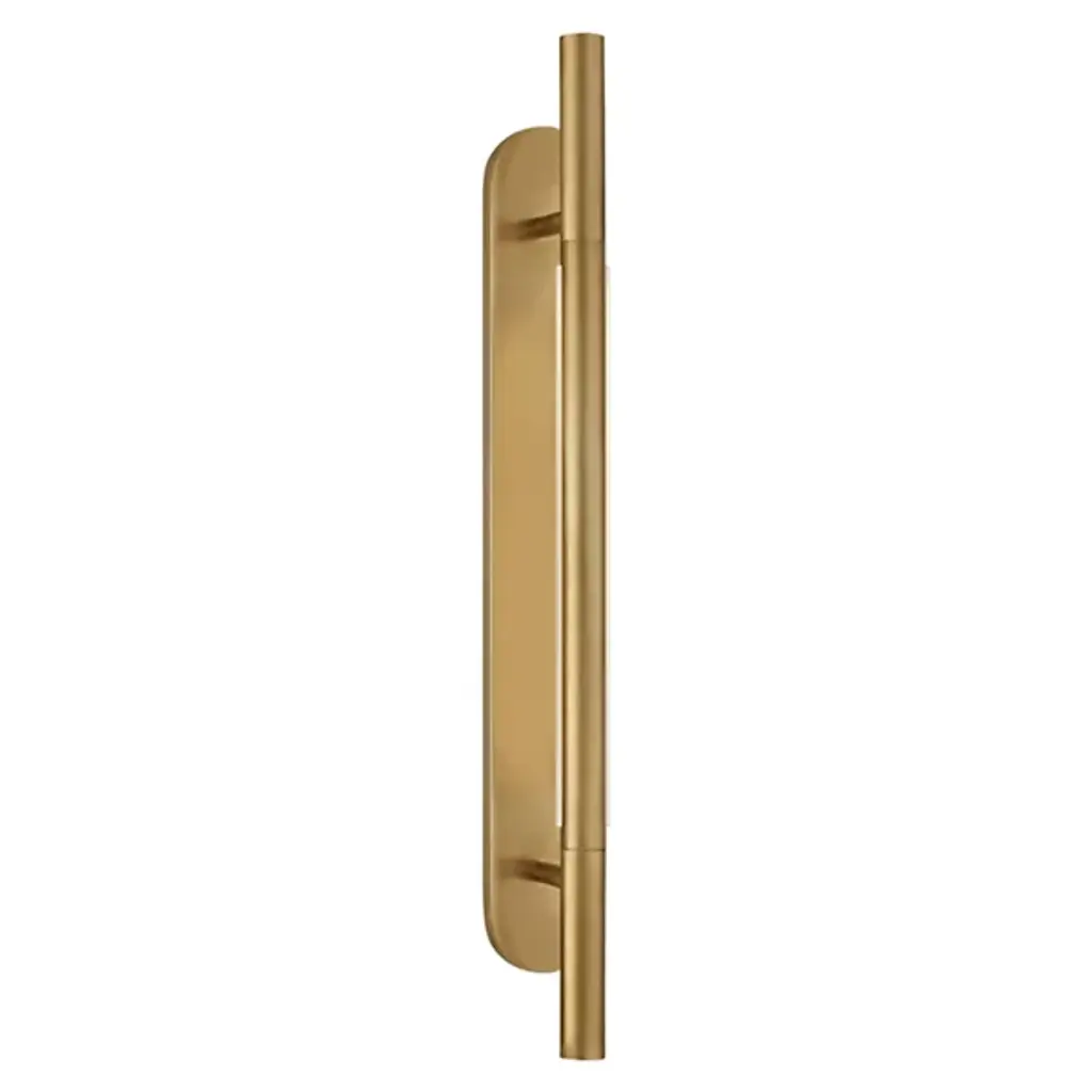 Give your layout an ultra-sleek design with the Rousseau Bracketed LED Wall Sconce by Visual Comfort Signature, formerly known as Visual Comfort. A cylindrical brass rod attaches to an ovular backplate at your wall. This rod maintains a vertical orientation which makes the sconce well-suited for placement near your home entrance. LED light projects from a shade of etched glass, providing radiant light for your living arrangement. The sconce comes in multiple sizes so that you may choose the fixture that is right for you.