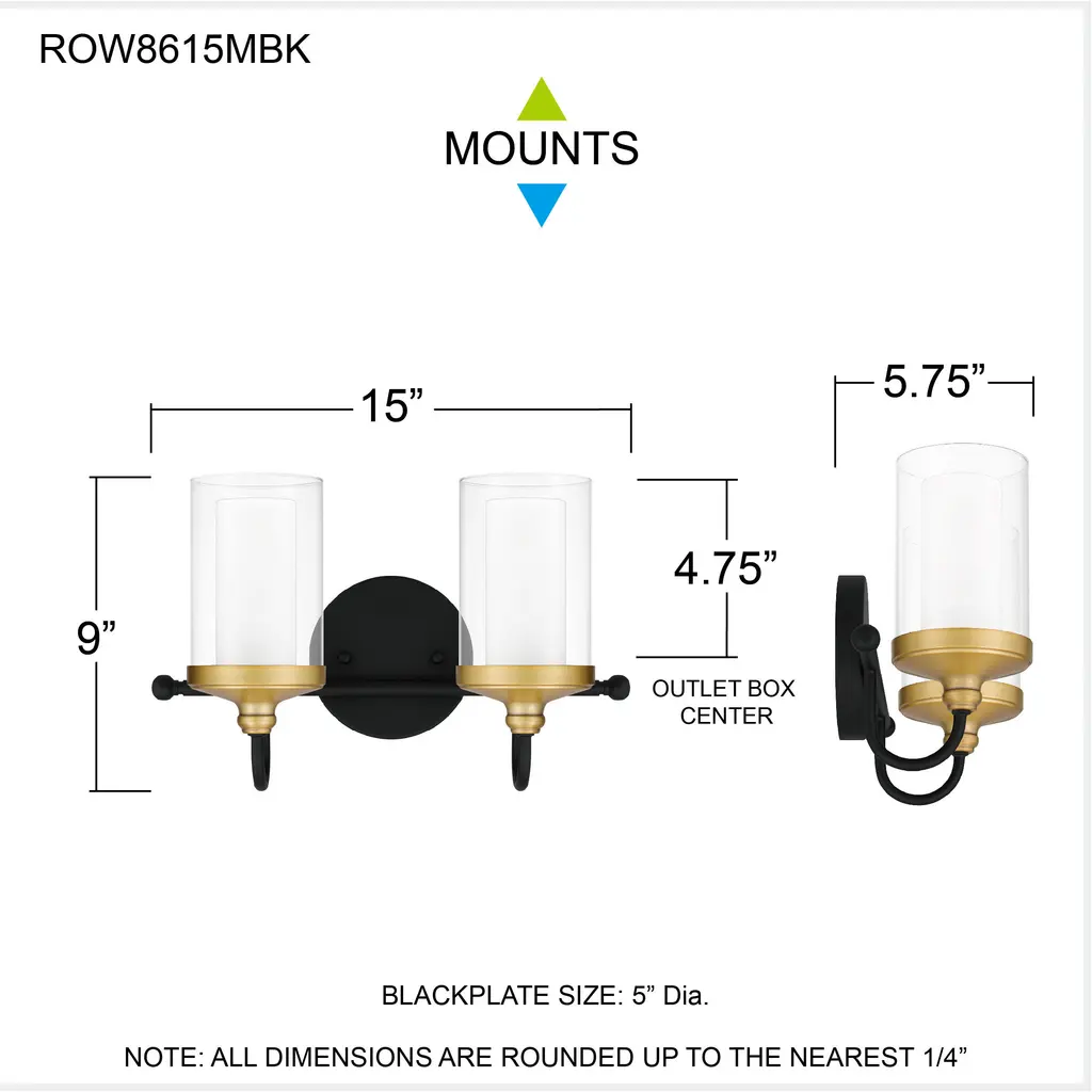 Rowland 2 Light 15 Inch Matte Black Bath Light Wall Light