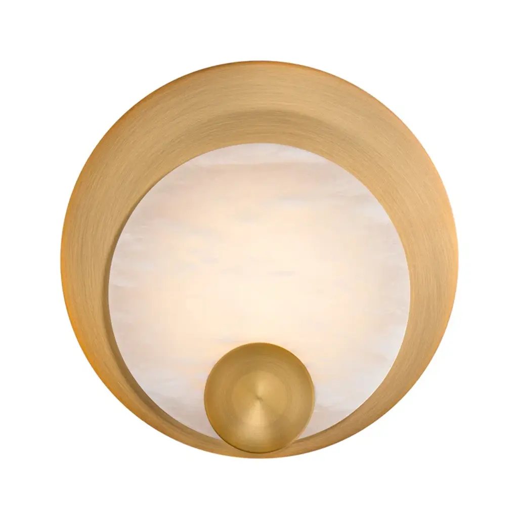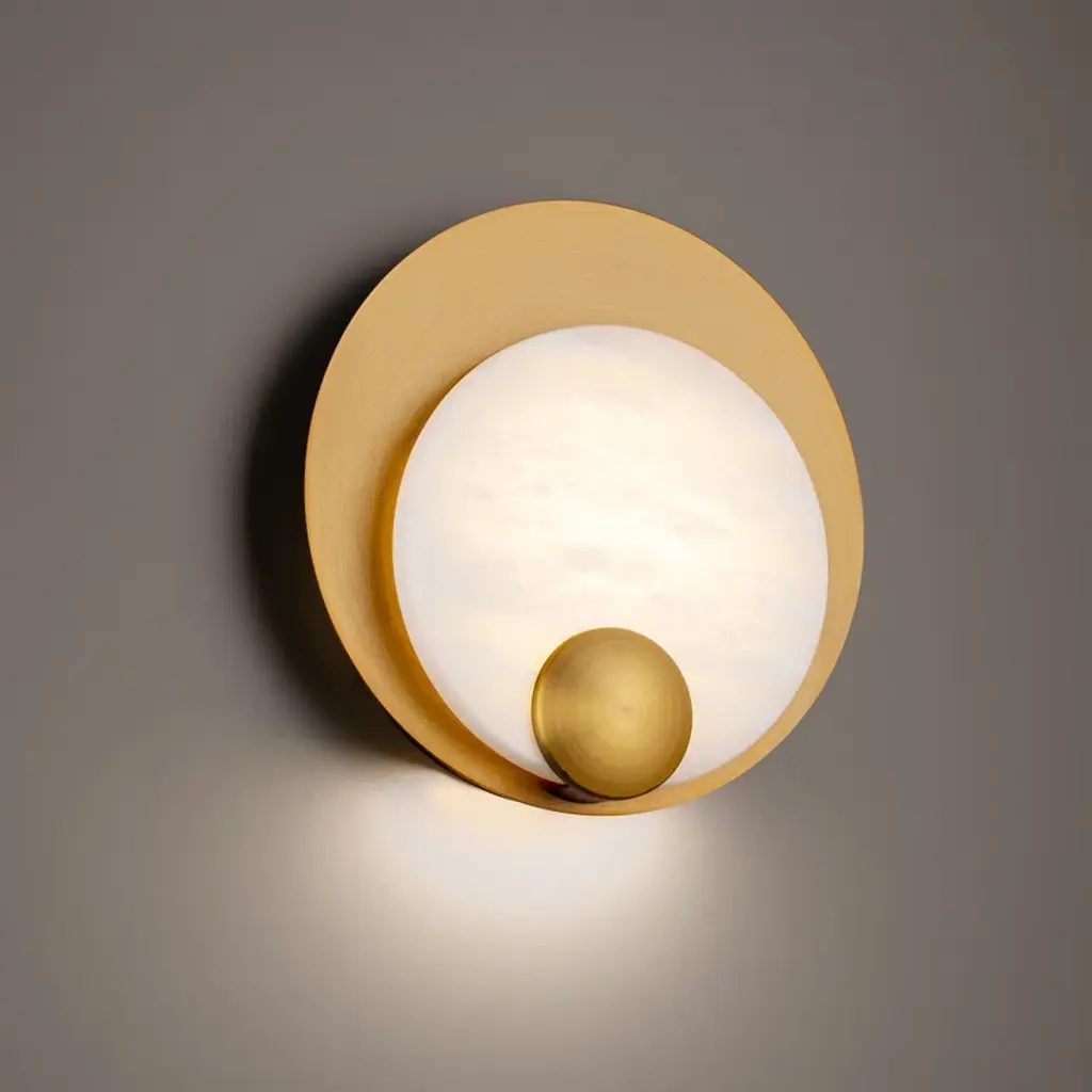 Alluring alabaster pairs with the intrigue of bold tones to mesmerize. Soft illumination highlights the nuances of the stone and casts warm reflections from the circular plates, creating an artful visual.