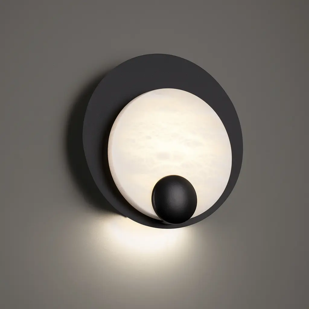 Alluring alabaster pairs with the intrigue of bold tones to mesmerize. Soft illumination highlights the nuances of the stone and casts warm reflections from the circular plates, creating an artful visual.
