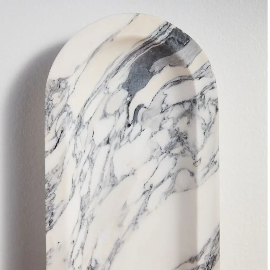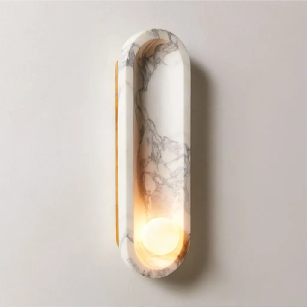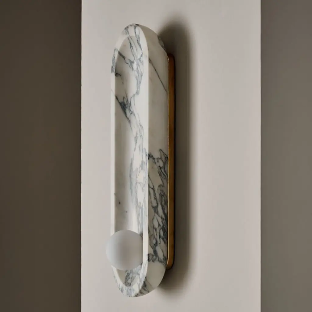 Crafted of solid Arabescato marble sourced from Italy, the Roxane sconce by goop is a sculptural work of art for the wall. Inspired by dynamic Italian midcentury designs, an opaline glass globe shade against Arabescato marble evokes the elegance of a pearl sitting in a tray. Prized for its bold grey veining, the timeless marble adds a feminine touch, complemented by a brass backplate. The brass is unlacquered, offering a living finish that will develop the patina of a vintage find. CB2 exclusive.