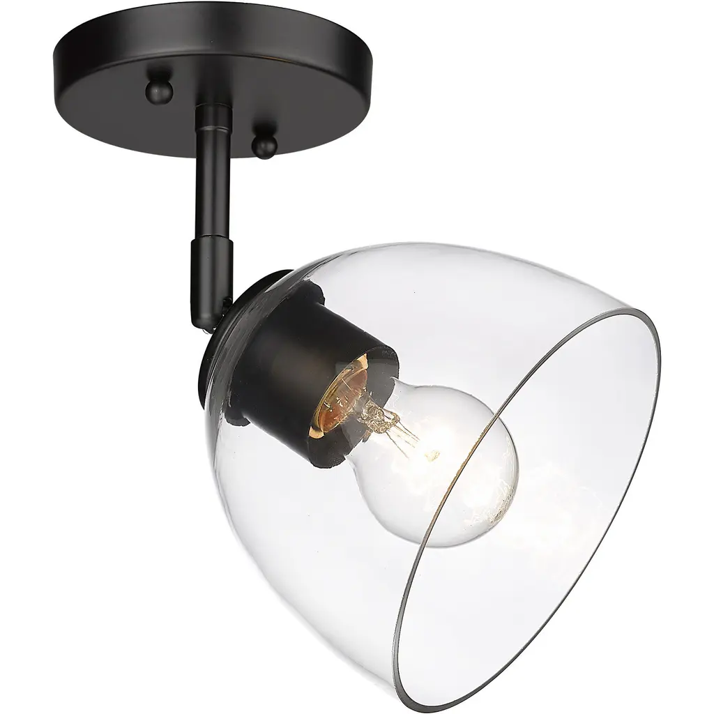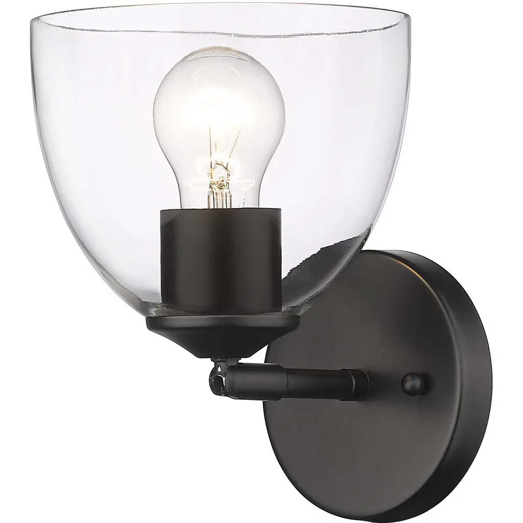 Illuminate your space with the Golden Lighting Roxie 1-light Wall Sconce in Matte Black. This fixture uniquely blends modern sophistication with classic charm, featuring a clear glass shade that enhances the ambiance of any room.Featuring a clear glass shade that provides brilliant, unobstructed light while allowing the elegance of the bulb to shine, this wall sconce is versatile enough to complement various styles from contemporary to traditional.The Matte Black finish is timeless and sleek, providing a non-reflective surface that absorbs light for a sophisticated look. Rated for Damp Location, this sconce is perfect for use in spaces with occasional moisture, such as bathrooms and covered areas.With adjustable directional heads, you can customize the lighting to showcase specific details or to create mood lighting. Overall Dimensions: 6.25"W x 8.13"H x 7.13"D. Requires 1 E26 Medium base bulb (not included) with a maximum wattage of 100.The Roxie wall sconce is a stylish addition to your home, providing quality illumination and a refined touch to your living spaces.