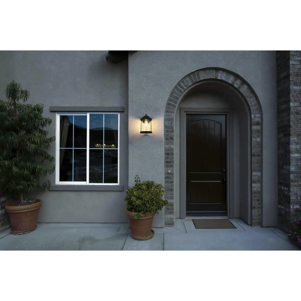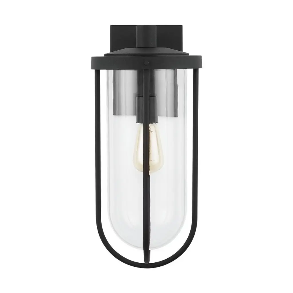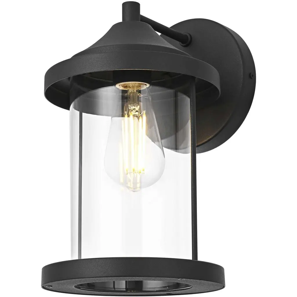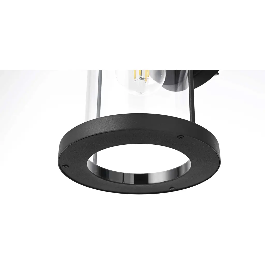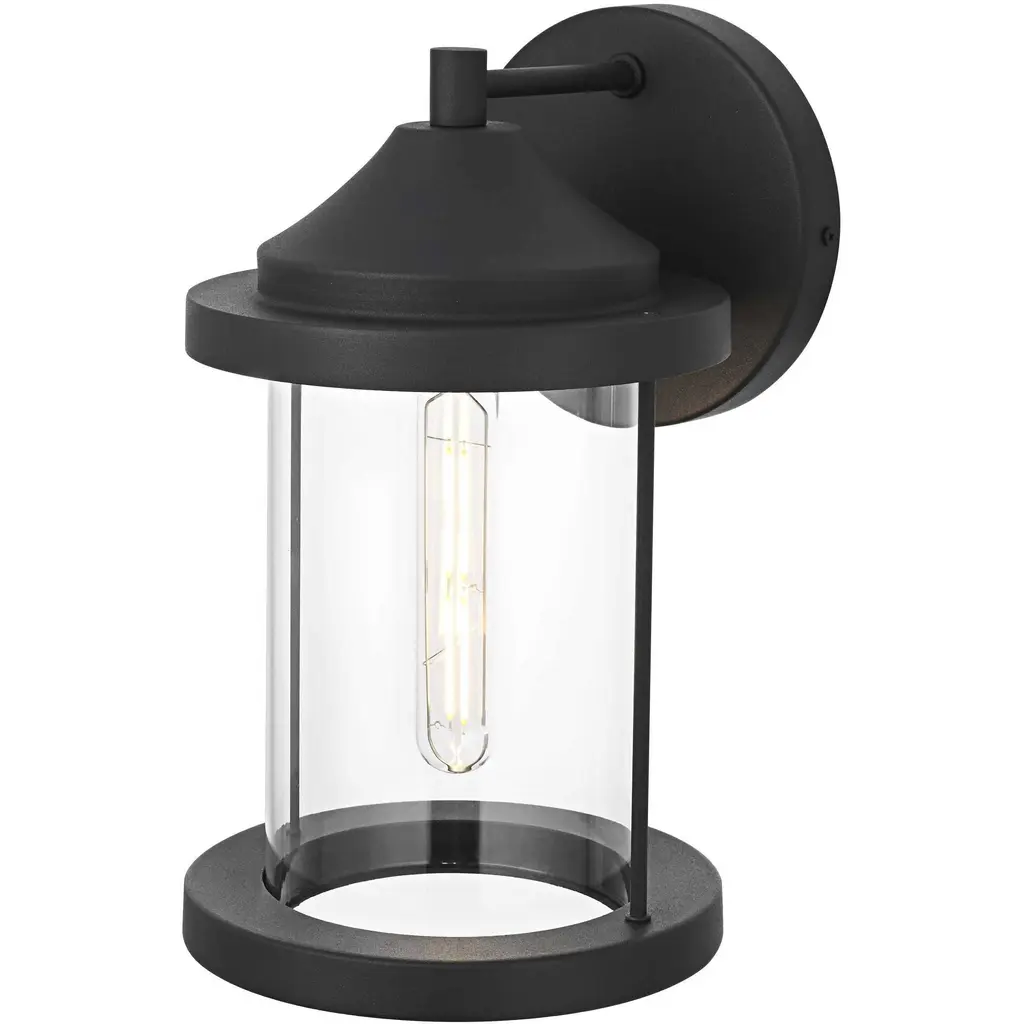 Add a touch of classic charm to your outdoor spaces with this timeless lantern-style wall light. Crafted from durable iron with a sleek circular backplate, this fixture combines traditional aesthetics with modern functionality. The clear glass cylinder provides unobstructed light, allowing the bulb to shine brilliantly, while the thick top and bottom trims frame the design with balance and structure. The open-bottom design not only enhances its aesthetic appeal but also ensures easy bulb replacement. Wet rated for outdoor durability, this light is perfect for porches, patios, and entryways. Featuring an E26 socket, it allows you to customize the look with your choice of bulb (not included). Bring style and practicality to your homes exterior with this refined and versatile lighting fixture.