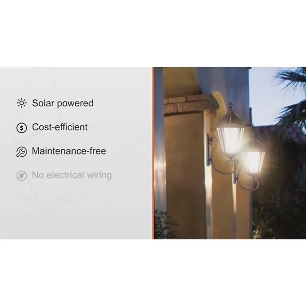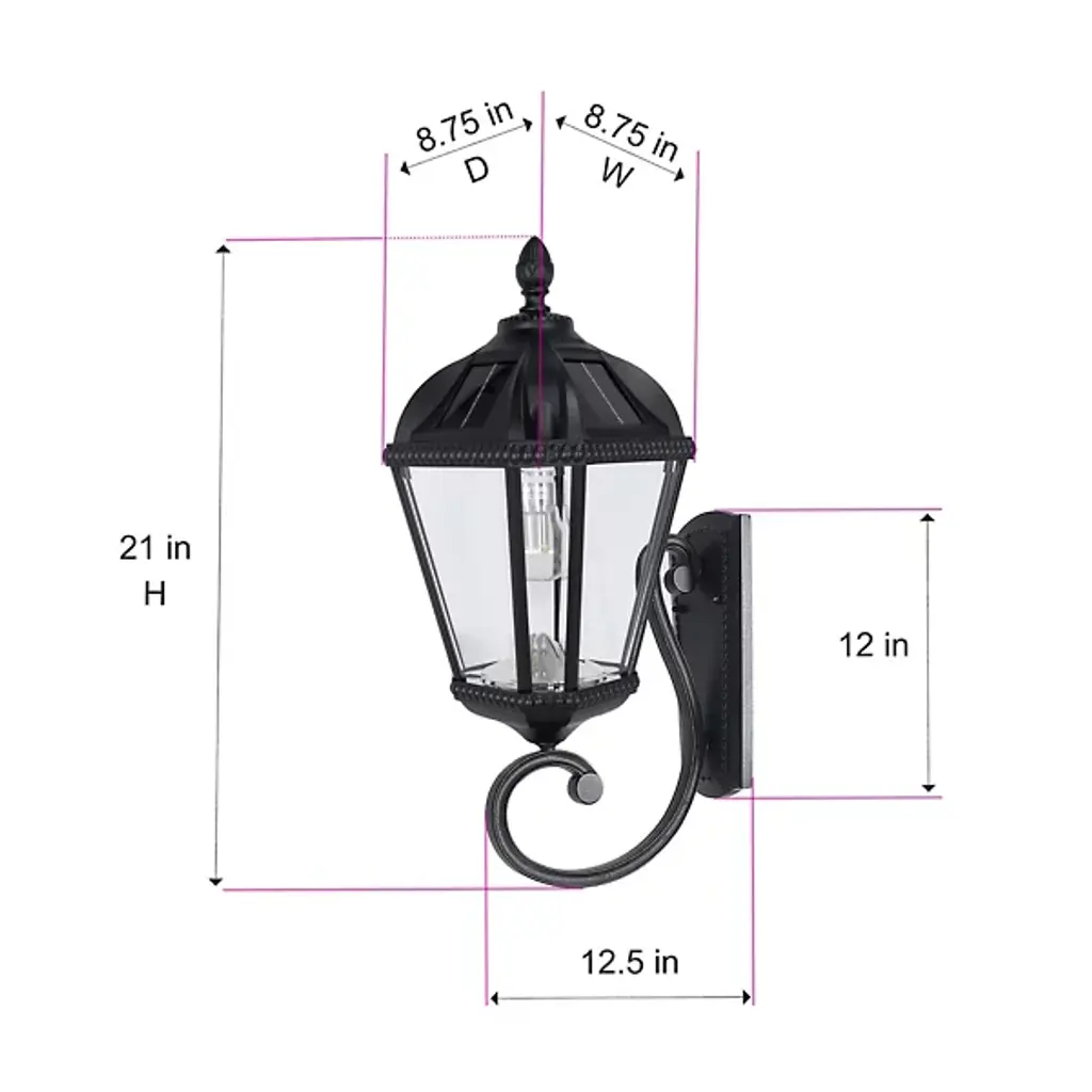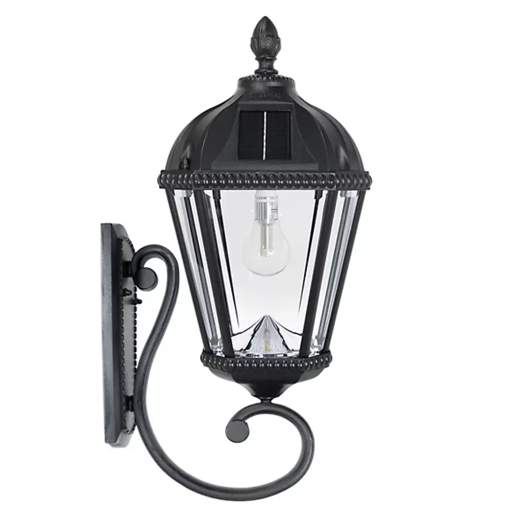 The Royal Bulb Solar LED Outdoor Wall Sconce from Gama Sonic combines New Orleans-inspired design with modern functionality. With a quick and easy installation process, this fixture provides a stylish and cost-effective alternative to traditional outdoor lighting. Constructed from weather-resistant cast aluminum with a powder-coated finish and beveled glass panes, it ensures durability. The brand's Solar LED light bulb technology offers 360-degree illumination, providing 120 lumens of warm white light for up to 12 hours on a full charge at dusk.
