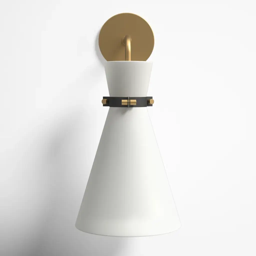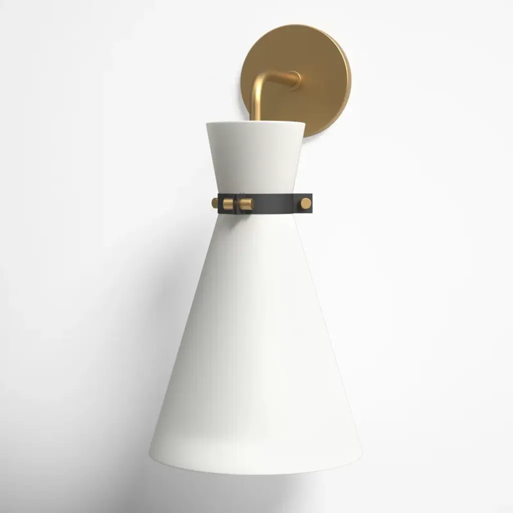 Along its midcentury-modern shade of linen, this fixture clasps a cuff of contrasting metals like a single statement piece of jewelry.