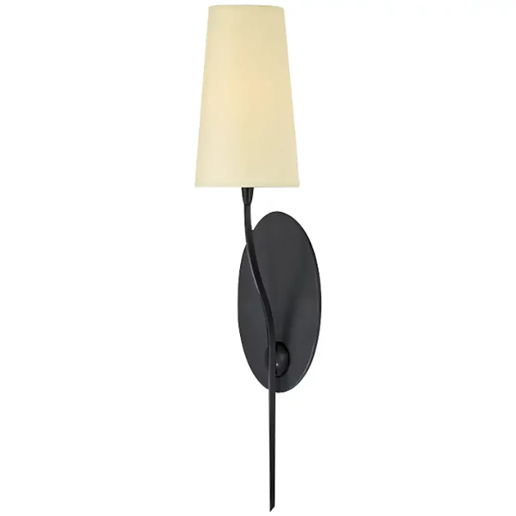 Natural and fluid, the Hudson Valley Rutland Wall Sconce offers a subtly floral, organic silhouette. A slender, gently curved arm is tapered at the end like a cut flower stem, topped with a conical shade like an unopened bud. The oval wall plate reinforces the fixture's curvy femininity.
