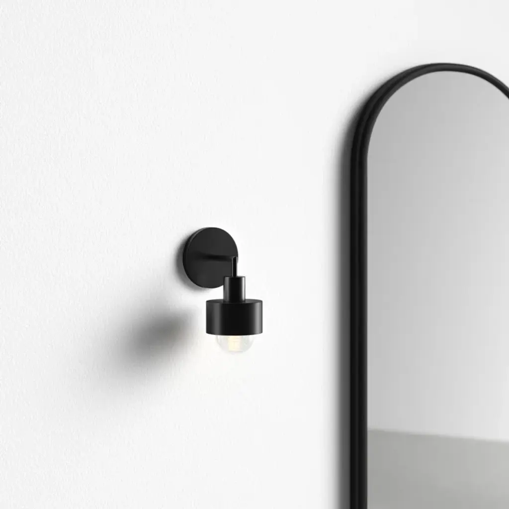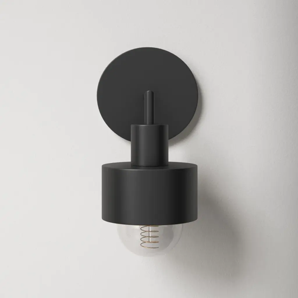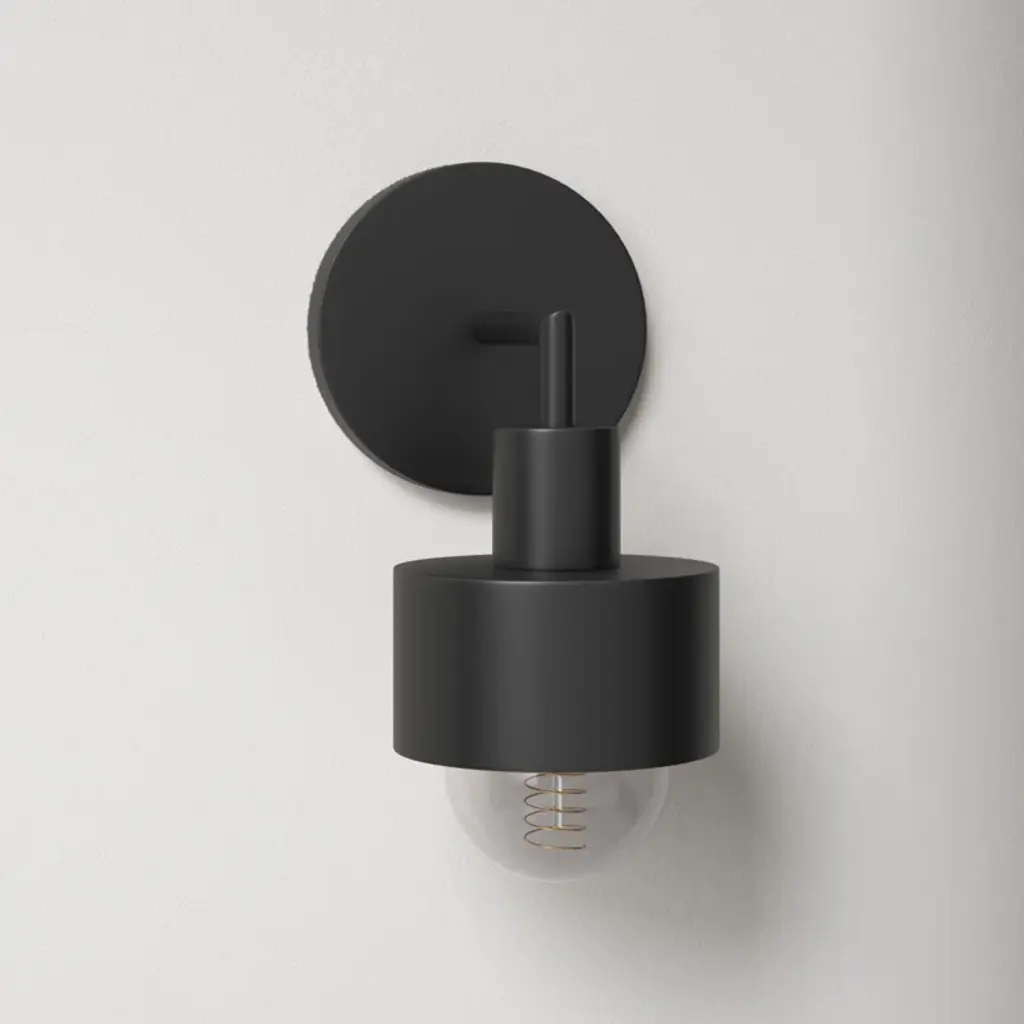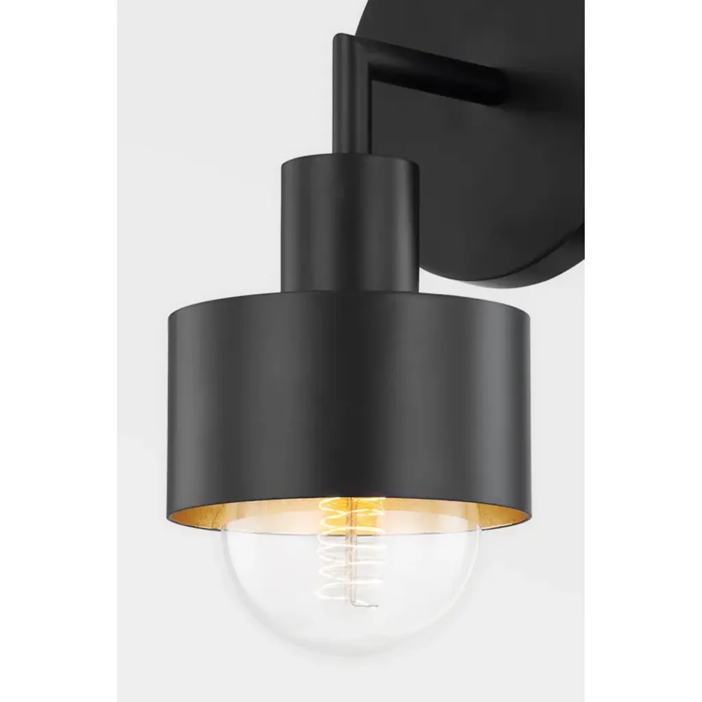 Industrial + directional. This sconce’s angular arm holds a circular shade that incorporates its socket into a sleek stepped silhouette. It’s built from iron + steel with a matte black finish, accented by a reflective gold-tone interior that warms the light from a single bulb.